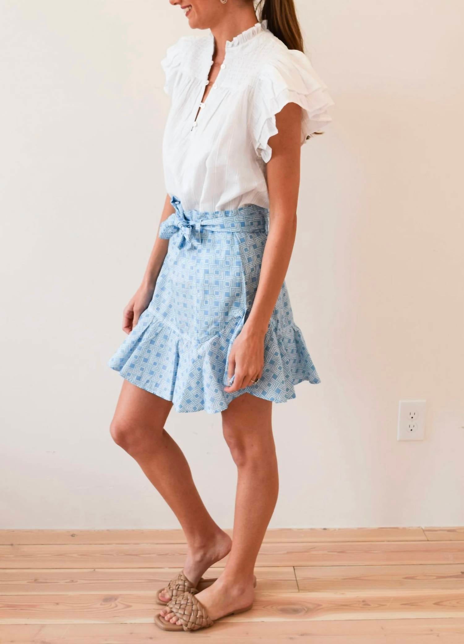 A timeless blouse that will never go out of style. Get to know our Smocked Top in White Pinstripe Solid – your new obsession! With its dramatic short flutter sleeves and thoughtful smocked accents at the front and back, this top is all about making a statement. The ruffle neckline adds an extra touch of charm, while the relaxed fit ensures you stay cool and comfy all day long. Pair it with your favorite denim for an effortlessly chic look that's perfect for brunch with the gals or a day out in the sun. Trust us, this top is bound to turn heads wherever you go! Short sleeves Button-down collar Relaxed fit
