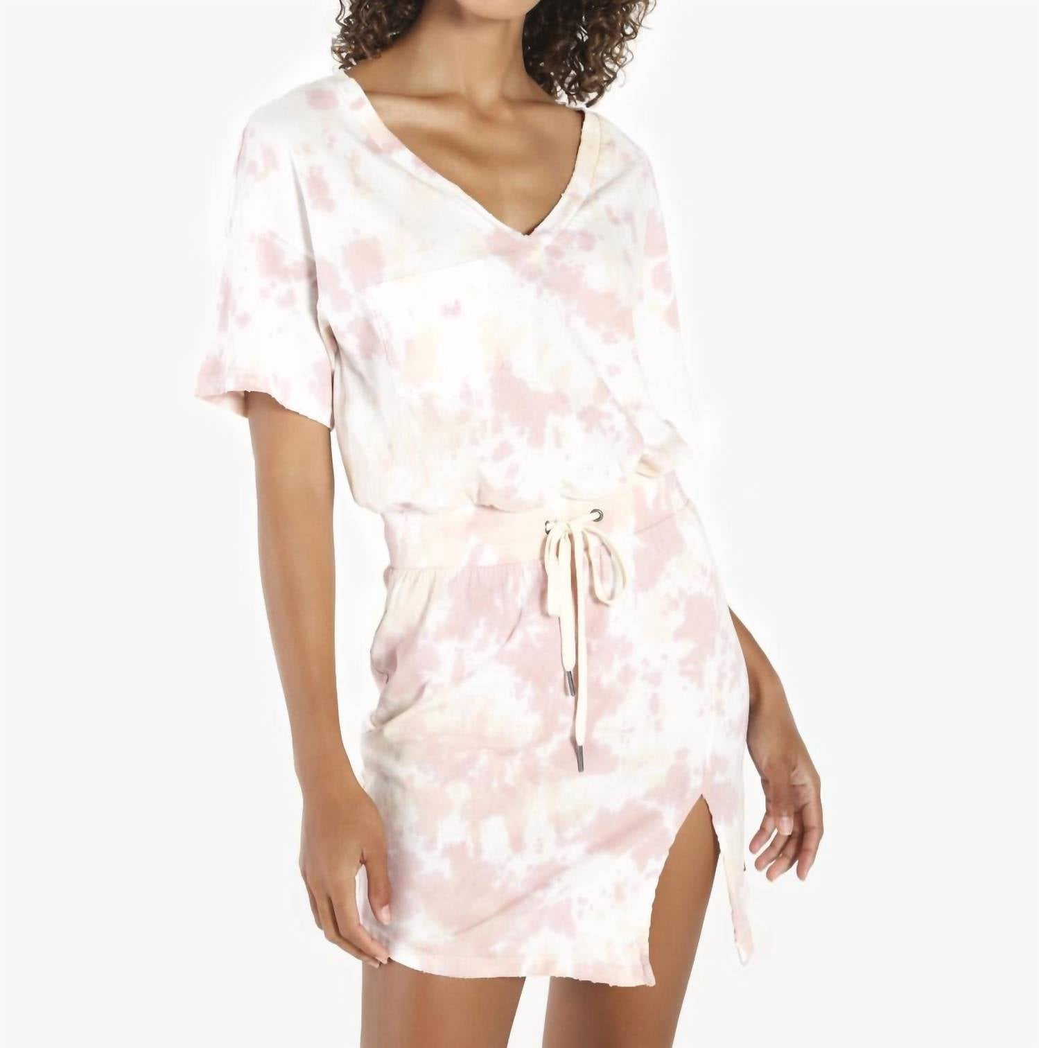 We took our bestselling relaxed fit V-neck tee dress and updated it with our newest Mauve Moon Tie Die. Featuring oversized sleeves, front leg slits, functional drawstring at the waist, grinding on the neck band, and front and back patch pockets
