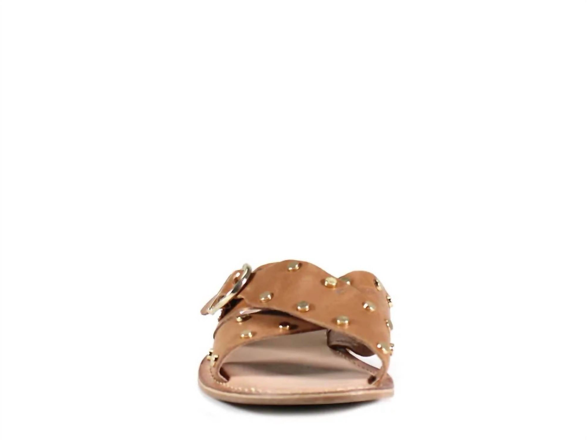 Flowy dresses, cropped pants, and even jumpsuits... this sandal works with them all! Chic sandals crafted from leather in a captivating tan hue. Slip-on convenience meets elegance. Crisscross strappy upper adorned with metallic studs. Featuring an adjustable buckle strap closure. Round open toe design. Lightly cushioned footbed for comfort. Heel Height: 0.5" flat. Set on a synthetic sole and lined with synthetic material.