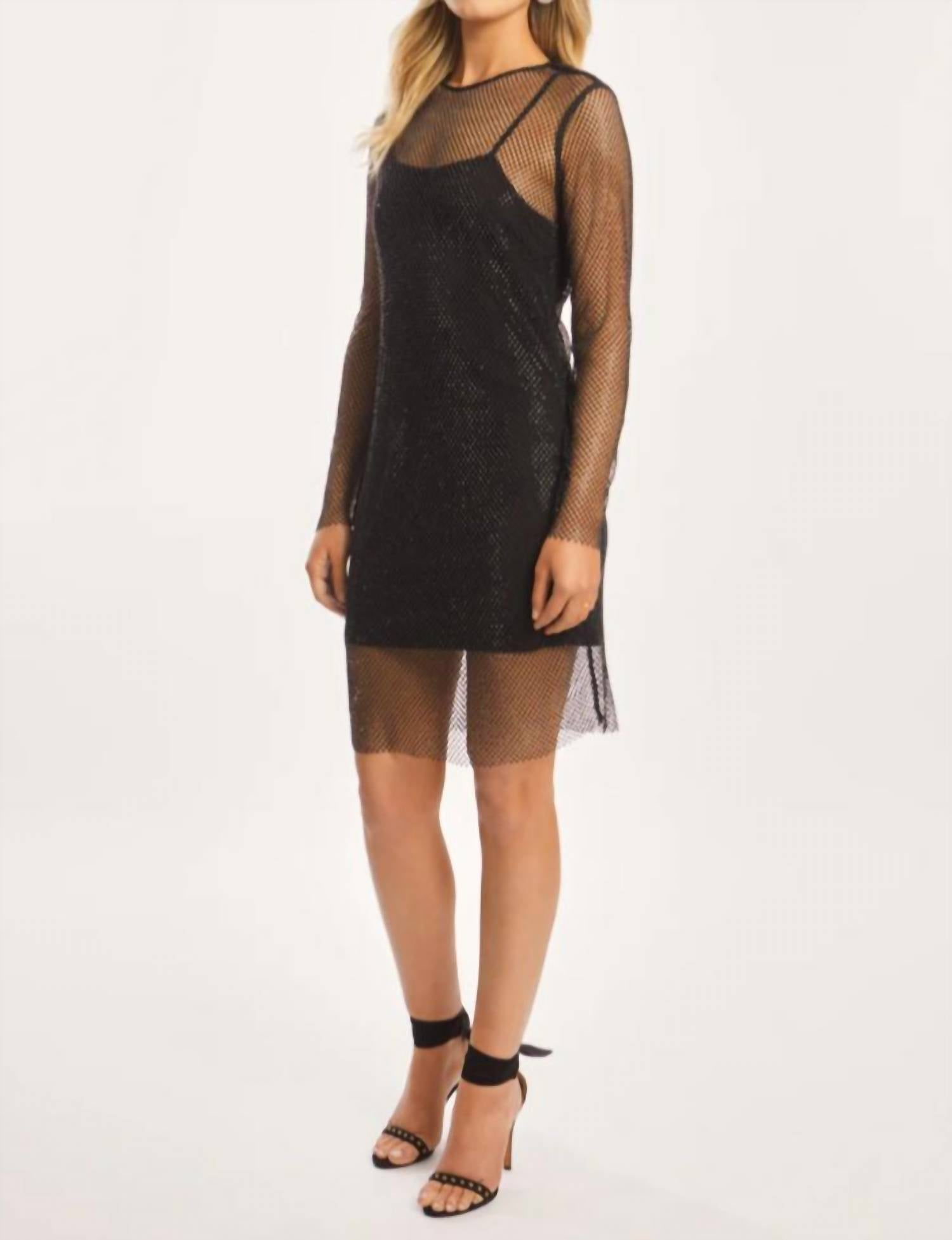 Step into sophistication with the Mercer Black Beaded Mesh Dress by CABALLERO, a stunning evening option that blends elegance with a touch of daring. This dress features sheer long fitted sleeves and a scoopneck, crafted from black beaded mesh for a layered, ethereal effect. The above knee length design includes a keyhole closure with a button and a spaghetti strap slip lining for added allure. Ideal for making a sophisticated statement at formal events, it comes with care instructions for hand washing.
