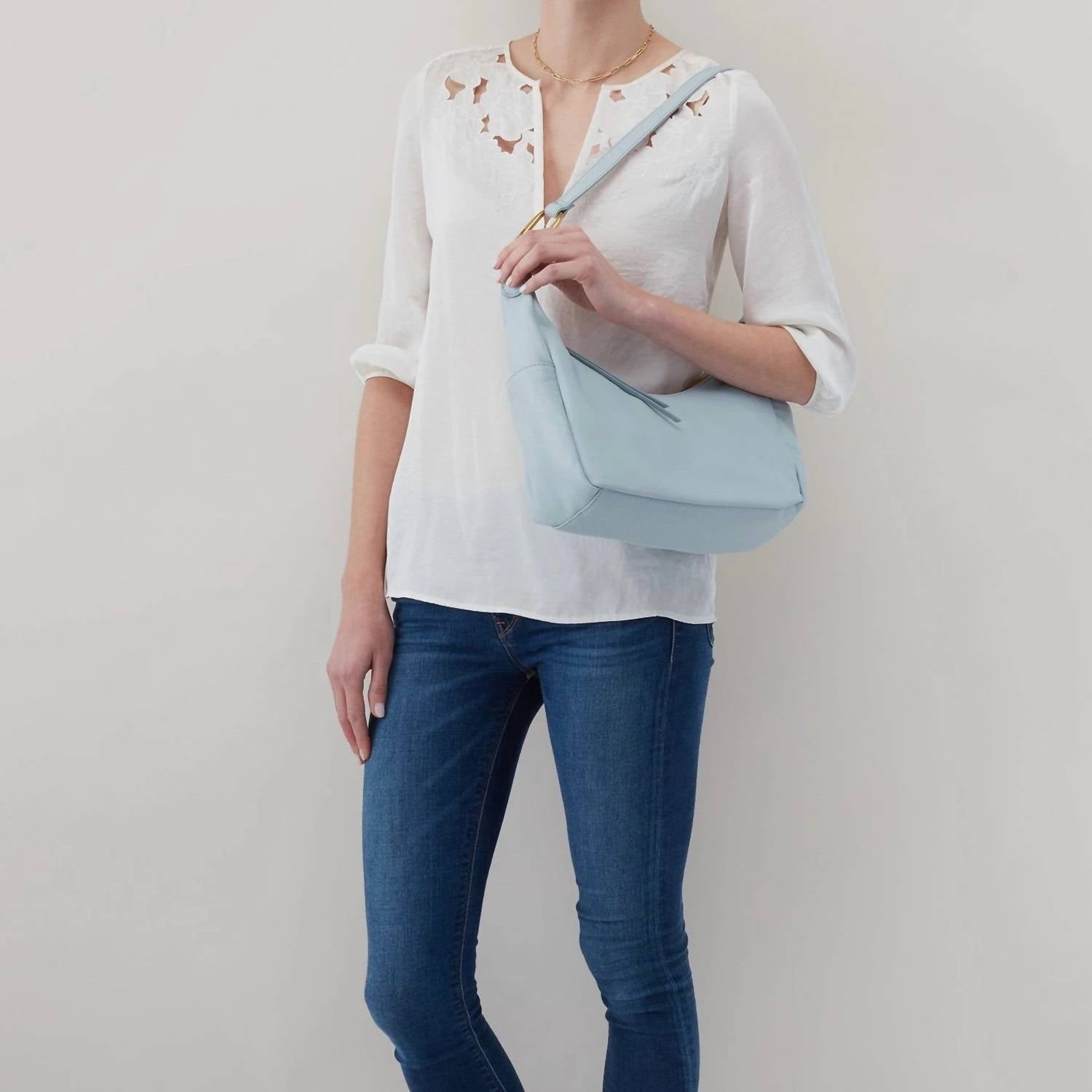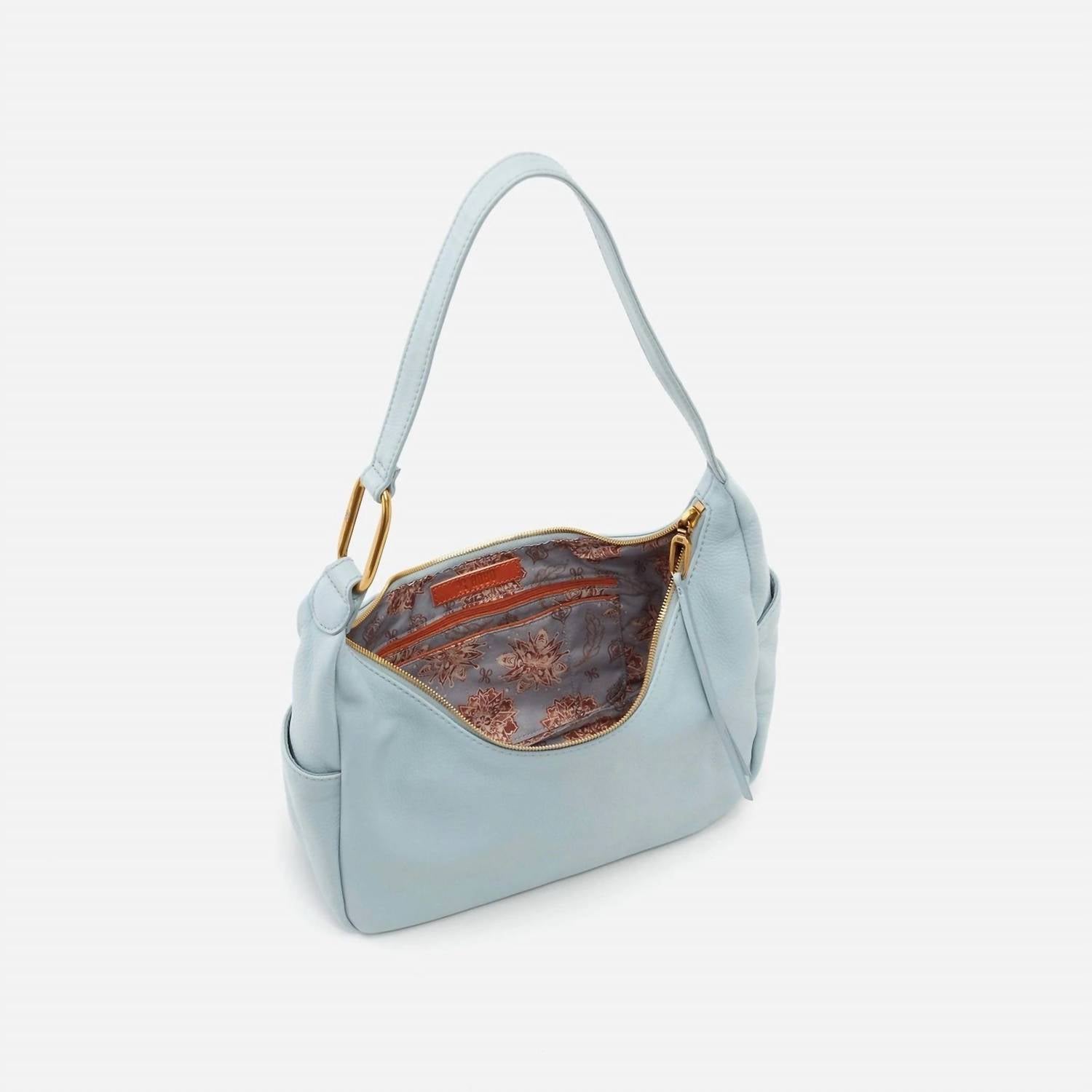 The HOBO Women's Fielder Shoulder Bag in Pale Blue is a perfect blend of style and functionality. Crafted from the signature velvet hide leather, this bag not only offers a soft touch but also enhances in beauty as it ages. It features a spacious interior and a hardware ring designed for attaching HOBO GO elements. Proudly designed without a specified country of origin, this bag is a must-have for those who value both elegance and practicality.