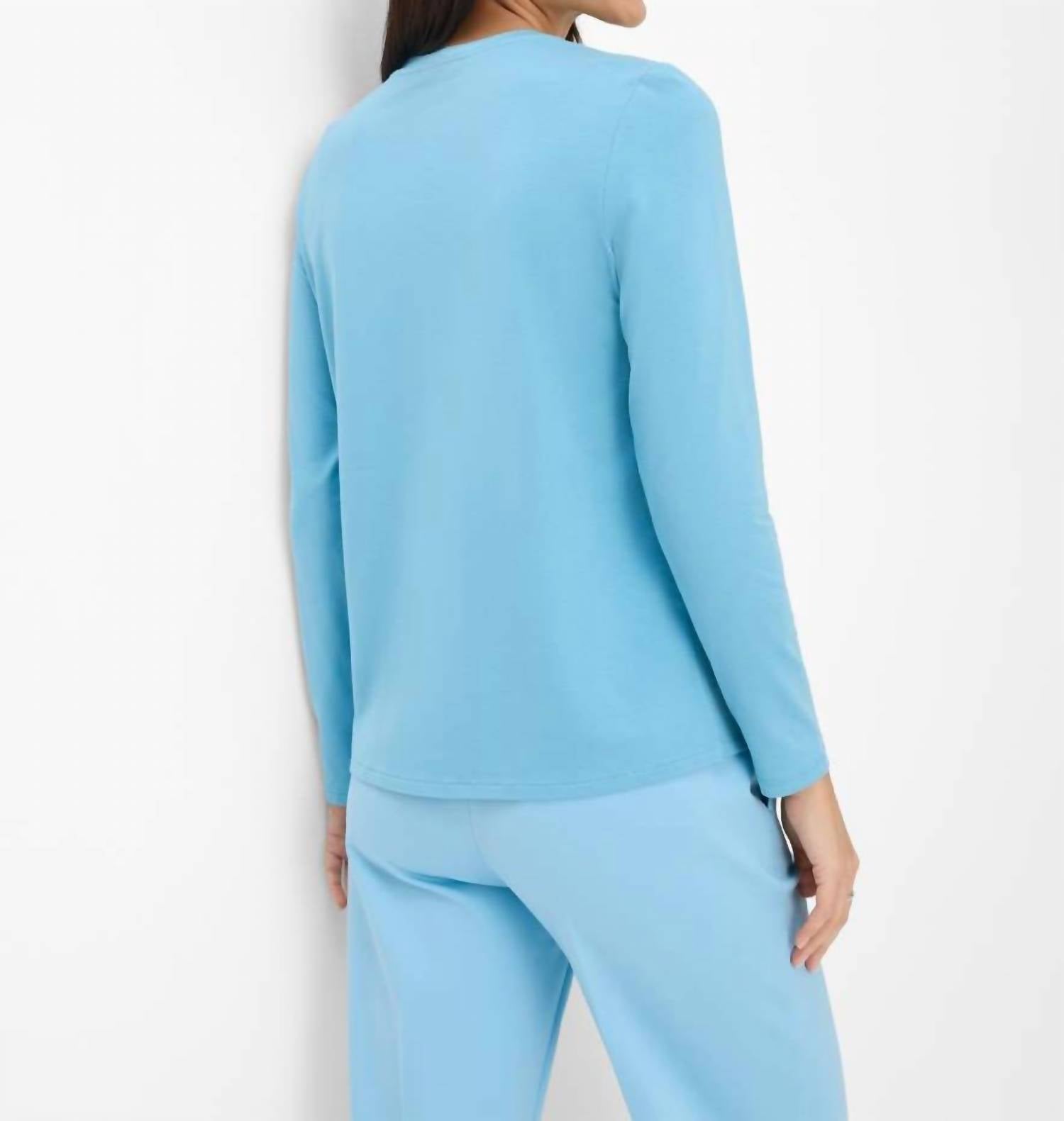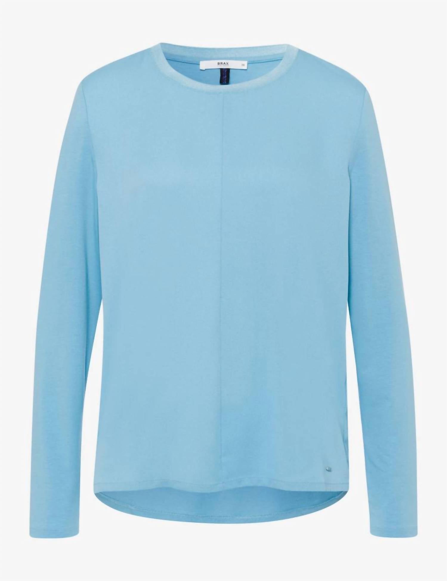 A long sleeve top you can wear with denim, skirts, well... just about anything! Experience the effortless elegance of the Clara Top by Brax, ideal for a minimalist wardrobe. Featuring long sleeves and a crewneck, this top combines a soft jersey blend of 47% Cotton, 47% Modal, and 6% Elastane with a vibrant woven polyester front for both comfort and style. With a convenient pull-on closure and a straight silhouette, it measures a chest circumference of 41" and a back length of 25.25". Care by machine washing on a gentle cycle, avoiding bleach, and laying it flat to dry in the shade to maintain its fit and color brilliance.