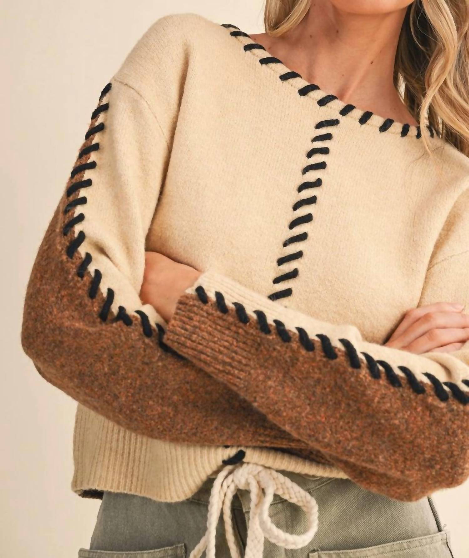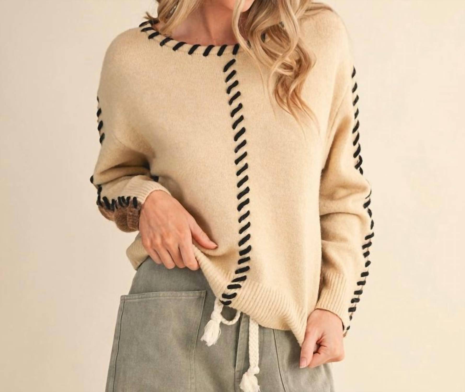 Throw this adorable cardigan over any cami or tank top. Discover the Whip Stitch Two-tone Sweater by &merci, a minimalist piece perfect for fall. Crafted from a cozy cotton blend, this cardigan features long drop shoulder sleeves and a boatneck for a relaxed fit. The taupe brown color is beautifully accented with contrast whip stitch detailing on the neckline, sleeves, and center front. With a pull-on style and easy care of hand washing and laying flat to dry, it's an essential addition to any back-to-school wardrobe.