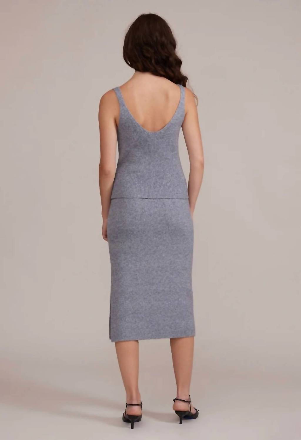 The midi length skirt is here to stay and we especially love this style. Elevate your evening ensemble with the Neo Knit Skirt by Lucy Paris, a timeless addition in sophisticated grey. This women's midi skirt features a wide ribbed waistband and a snug silhouette, crafted from a luxurious knit material. 54% Nylon, 27% Wool, 18% Acrylic, 1% Spandex. Made in the US. Pull on. Turn inside out, hand wash cold, line dry.