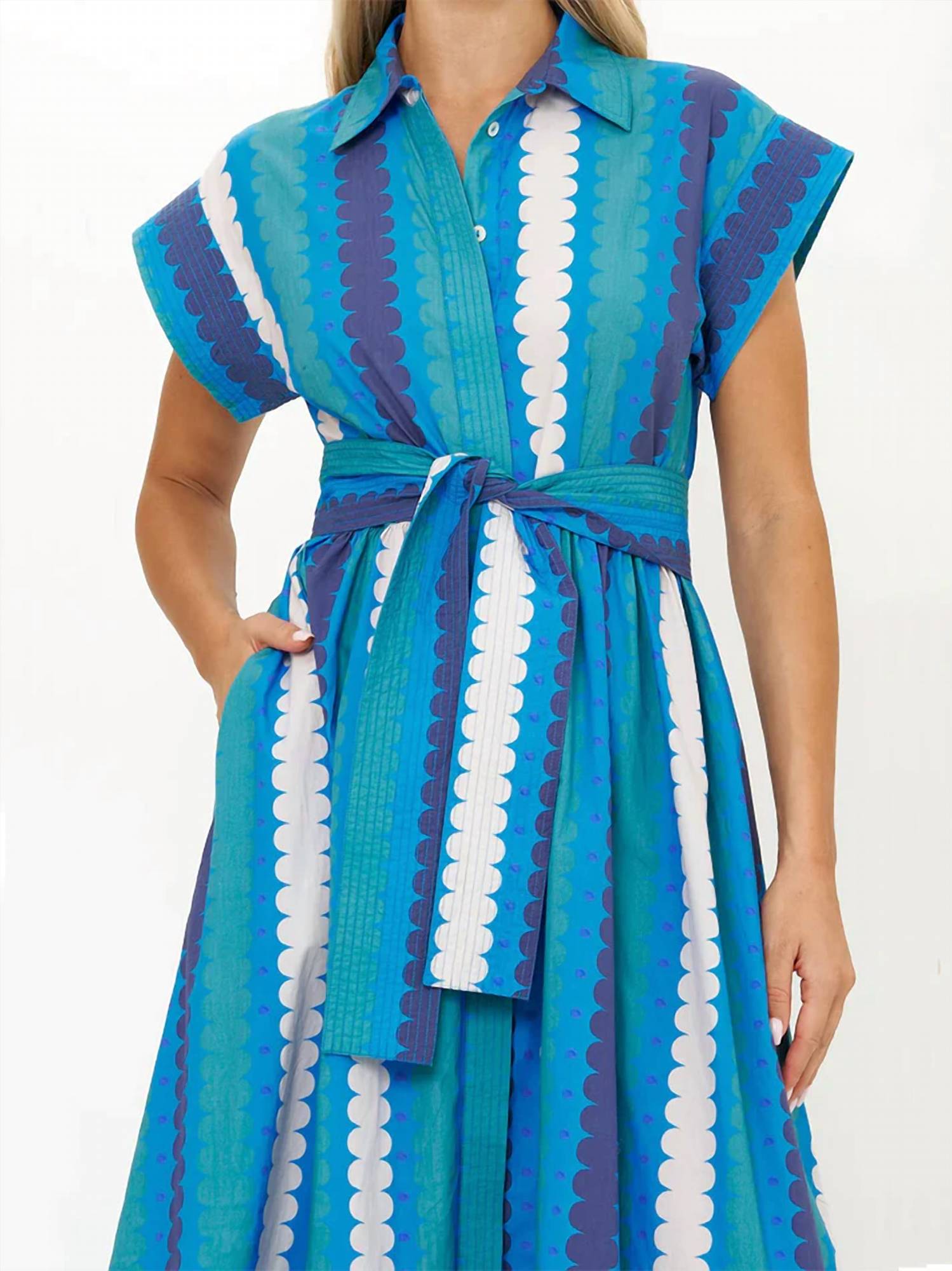 Just add slides or mules and you are good to go. Discover the Belted Shirt Dress by Oliphant in a striking Meko Blue, a stylish choice for summer elegance. With short sleeves and crafted from 100% cotton, this dress features a collared neckline and a flattering midi length circle skirt. Adorned with mother of pearl button closures and detailed with double top stitching, it includes a matching belt and convenient pockets at the side seams. Experience practicality and style combined, perfect for a versatile summer wardrobe.