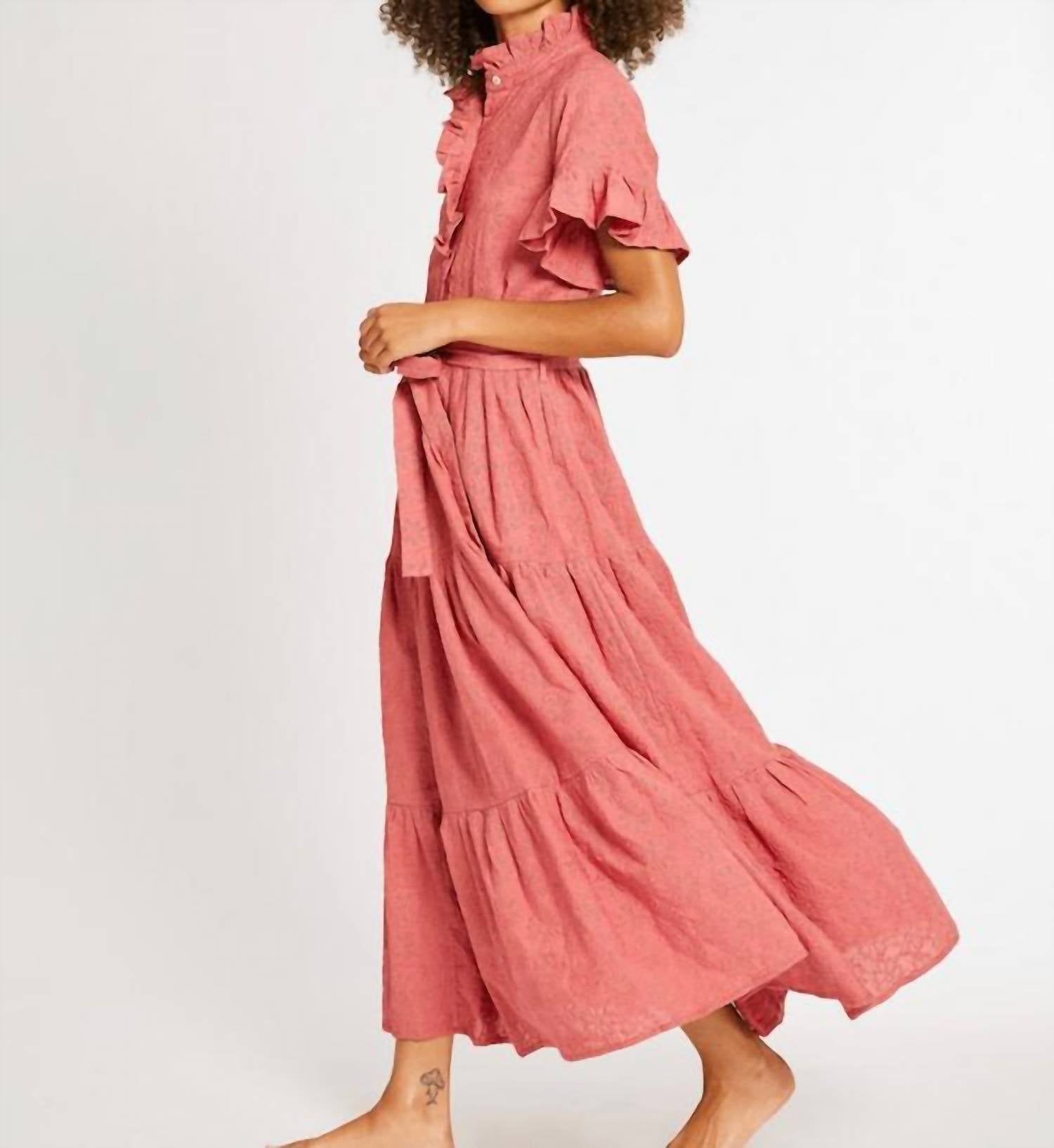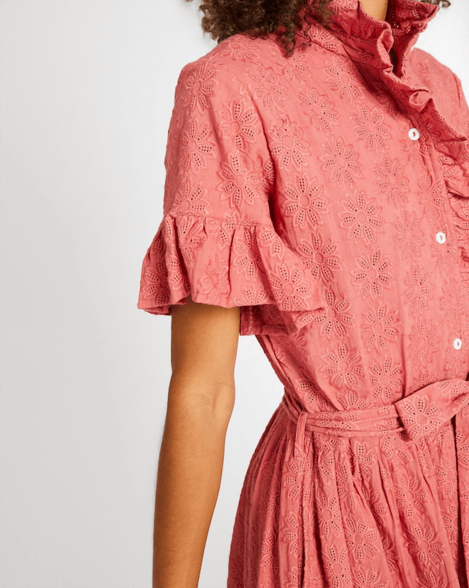 Style this maxi with your favorite statement necklace and sandals for the perfect look. Introducing the Victoria Eyelet Dress by MILLE, a statement piece in a stunning Rosewood hue, perfect for birthdays and Mother's Day alike. This maxi dress features short sleeves and is crafted from 100% cotton, providing both comfort and style. It showcases a button-down closure with a ruffle placket and a belted waist, ensuring a clean, polished look. Embrace the trend of Quiet Luxury with this textured, A-line silhouette, ideally suited for summer occasions.