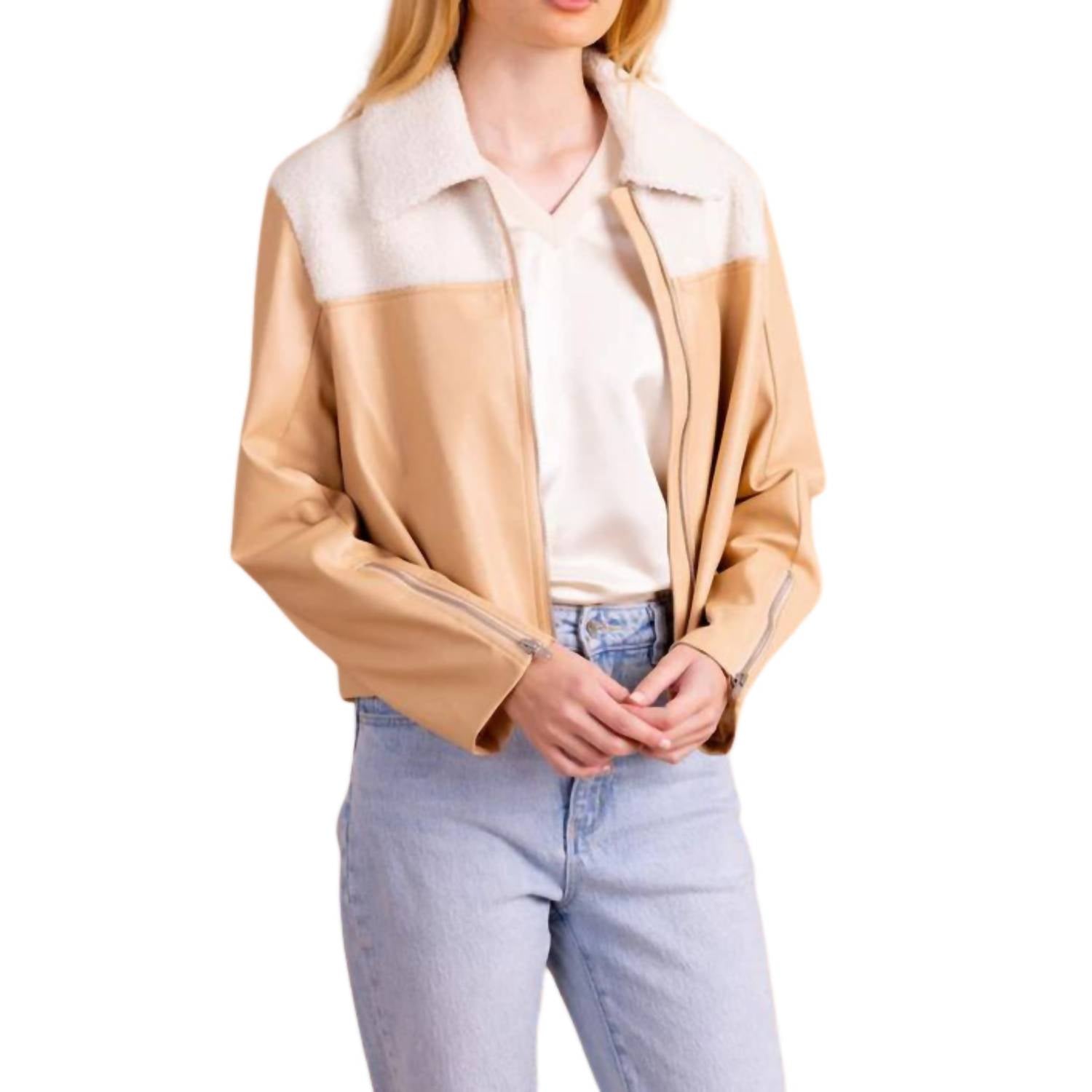 Cute, casual, and comfortable. This jacket is a must have. Introducing the Bristol Leather Jacket by S'edge in a warm Gingerbread hue, a standout piece for any women's wardrobe. This casual jacket is crafted from high-quality vegan leather with chic sherpa details, offering both style and comfort. It features a long sleeve design with a classic collar and a zip closure for easy wear. Imported and easy to care for, simply machine wash cold and lay flat to dry.