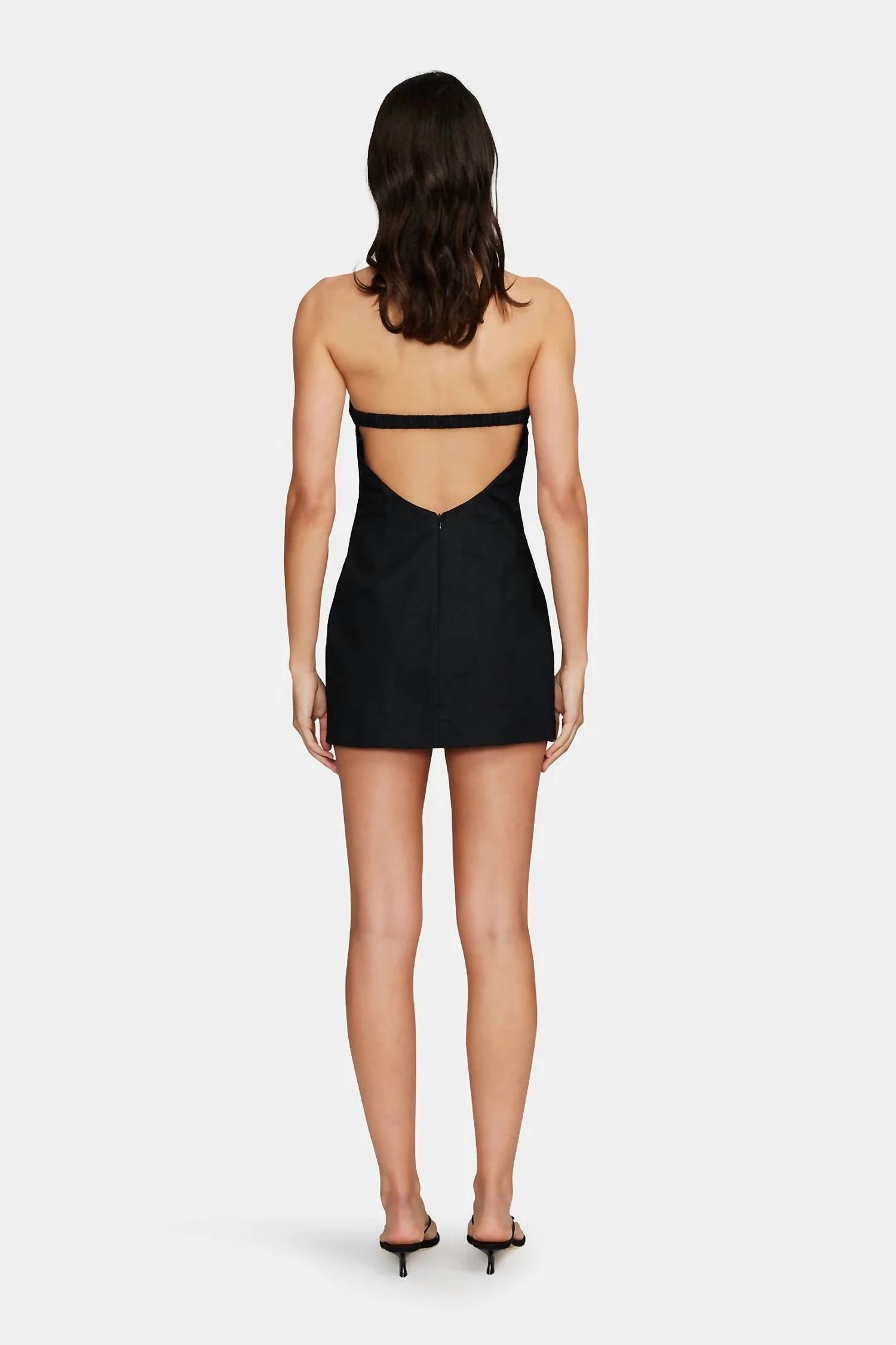 The perfect mini dress for those warmer months. Introducing the Libby Linen Strapless Mini Dress by Ownley, a chic black dress perfect for any summer occasion. This bodycon mini dress features an elasticated back detail and a low open back, enhancing its modern silhouette. Made from 100% linen with a 100% cotton lining, it offers both comfort and style. Closure: Center back zip closure. Care: Dry clean only.