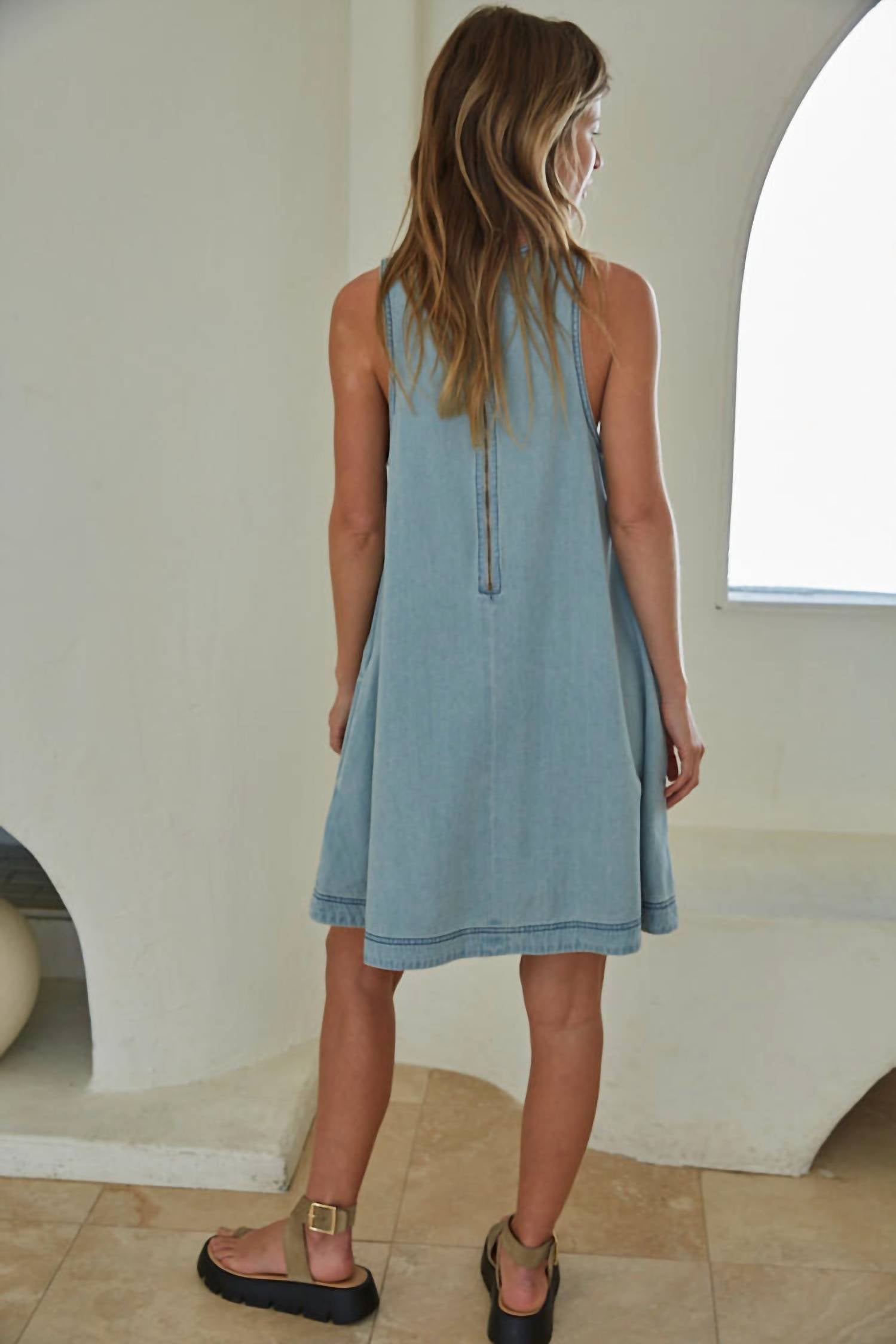 The perfect mini dress for those warmer months. The Swing Mini Dress by By Together, a charming denim piece for women, is designed for casual summer occasions like dinner parties. This minimalist A-line dress has short sleeves, a solid pattern, and features a convenient zip closure. The raw hem and subtle stitching add a touch of relaxed elegance to its carefree silhouette. Enjoy pairing it effortlessly with your favorite boots and embrace the sunshine in style.