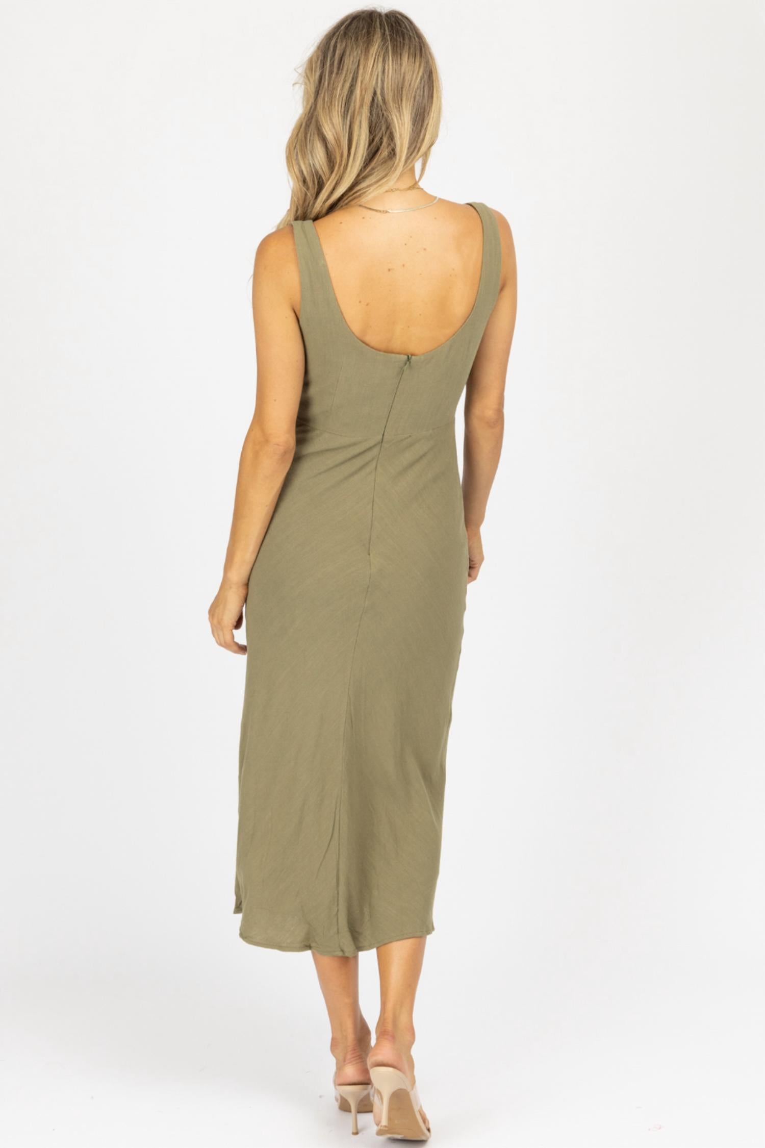 Midi length, open front with a twist, linen, sleeveless, back zipper. Self: 70% cotton, 30% linen. Lining: 100% cotton. The model is wearing a size small. Height 5'8, and the dress size 2.