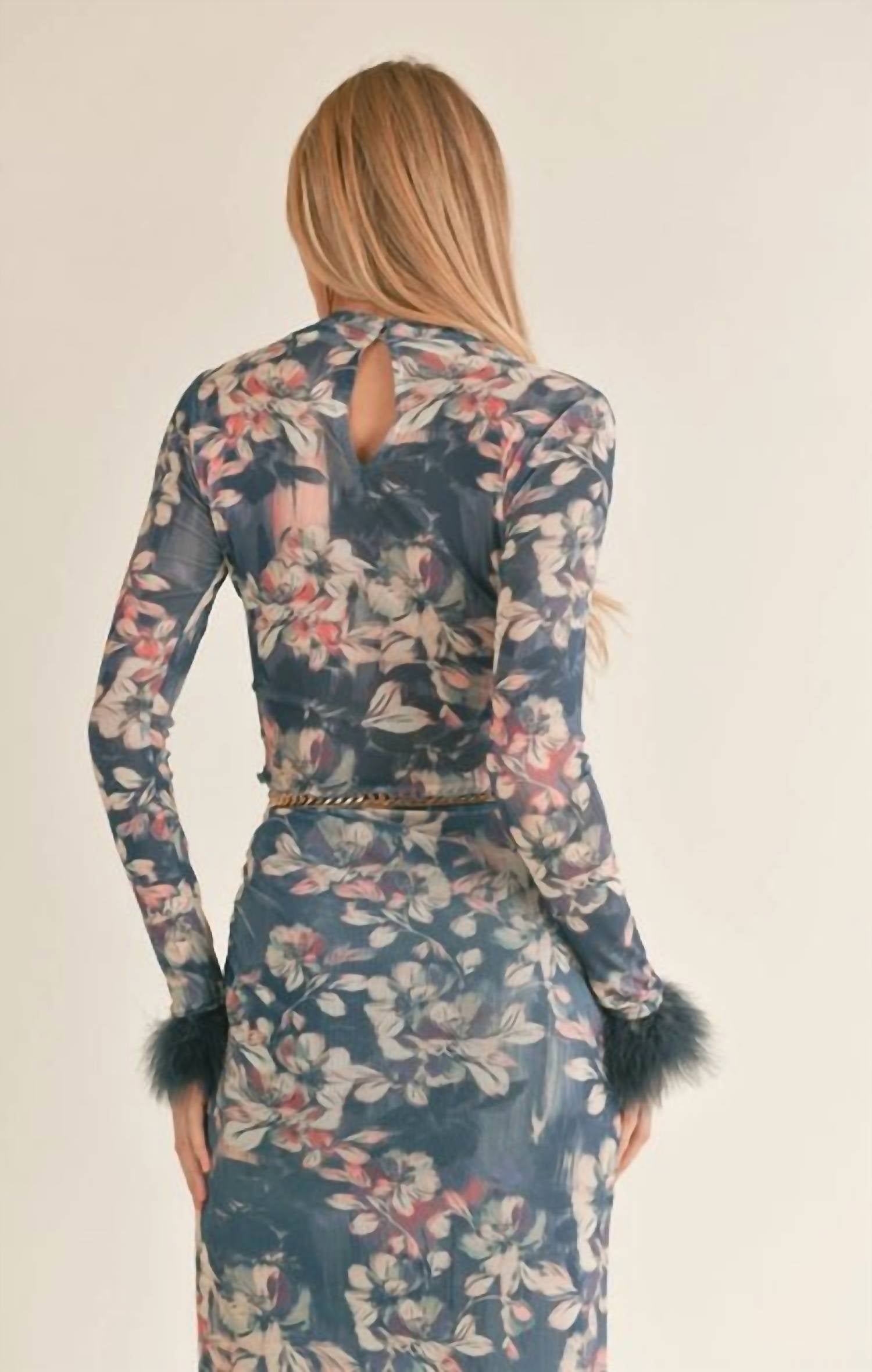Pair this with your favorite jeans and slides for your next girls night out. Embrace elegance with the Vegan Feather Trim Floral Print Long Sleeve Top by SAGE THE LABEL in a captivating midnight blue floral print. Crafted with a fitted design for a flattering fit, this top combines style and comfort with its 97% polyester and 3% spandex self-material and 100% polyester lining. Care instructions recommend hand washing and line drying to maintain the quality of the fabric. The model is wearing a size small, perfectly tailored for a chic holiday party look.