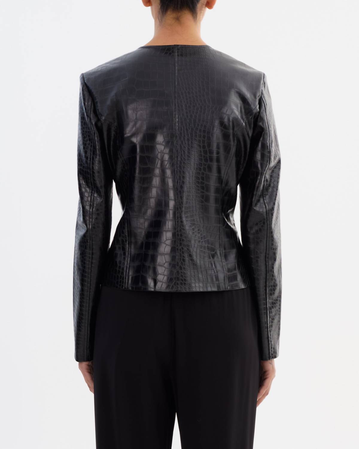 Cute, casual, and comfortable. This jacket is a must have. Introducing the Agnes Jacket by LAMARQUE, a chic addition to your winter wardrobe, perfect for holiday parties. This women's casual jacket comes in a striking black hue with a textured pattern, crafted from high-quality faux leather for a modern appeal. The long sleeves and crewneck design ensure a flattering fit, while functional pockets add practicality. Made for effortless style, it's a staple piece for any occasion.