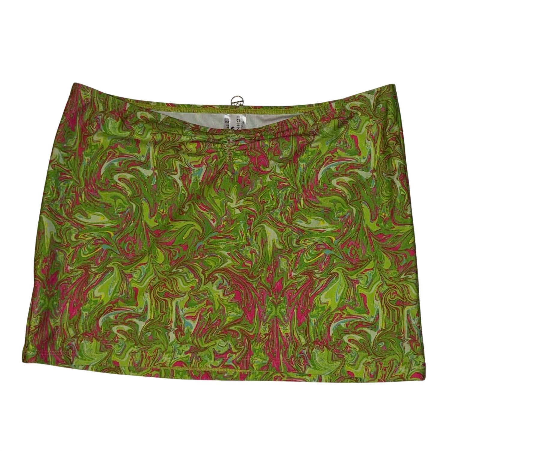 This cute and flattering swimsuit is perfect for making a splash at the pool, lounging on sun-kissed beaches, and staying stylish throughout the upcoming summer season. Elevate your beachwear with the Billy Skirt by Bananhot, crafted in a vibrant Green Illusion print for a standout summer look. This low-rise mini swim bottom features a playful ruched detail at the center front, making it a perfect vacation essential. Composition: 85% Polyamide, 5% Elastane. Made in Thailand. Care: Hand wash and line dry.
