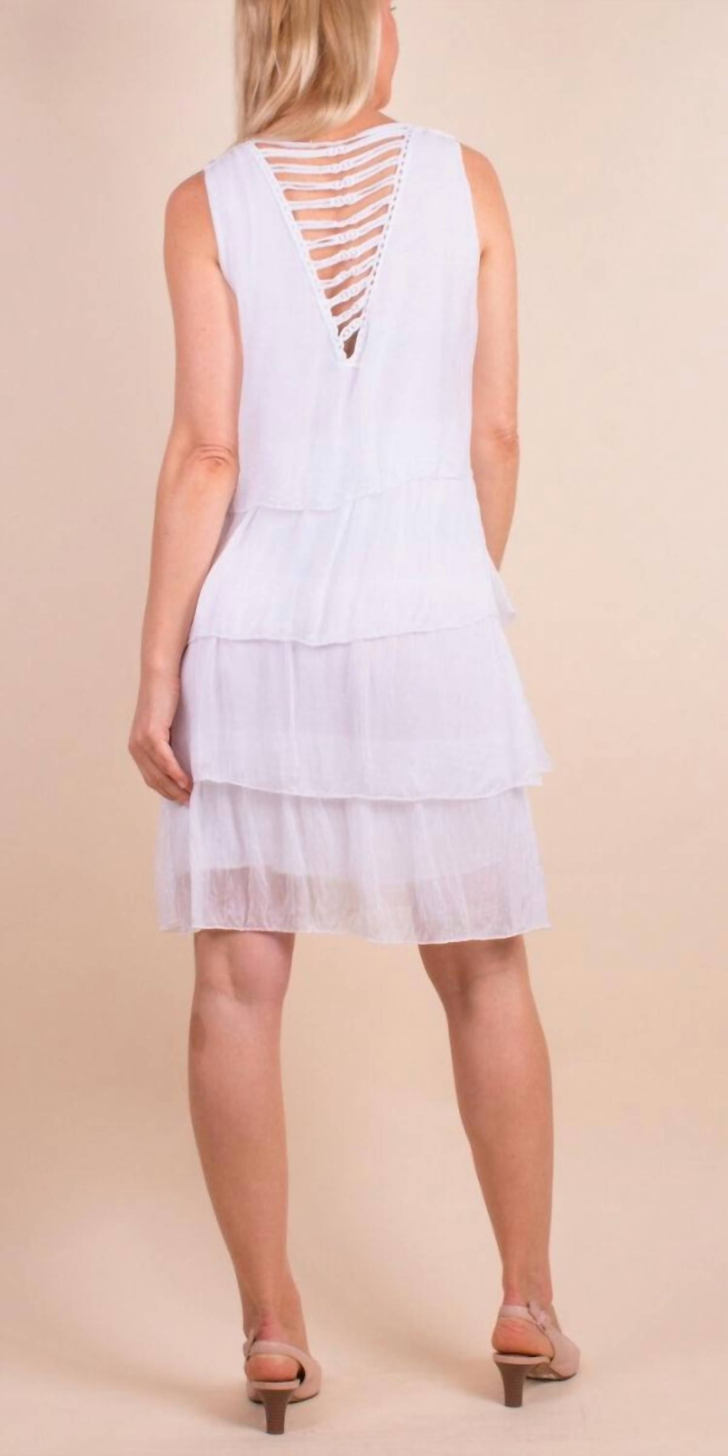The kind of easy and flattering dress you'll be reaching for all season long. Minimalist piece perfect for summer housewarming events. Sleeveless tiered mini dress is beautifully crafted with a scoop neckline and a unique V-shaped embroidery on the back. Composed of 30% Silk and 70% Viscose on the exterior, with an interior blend of 95% Viscose and 5% Elastic. Made in Italy. Sheath dress offers a pull-on closure. Best cared for by hand washing. Suitable for one size fits all, modeled at a height of 5'7".