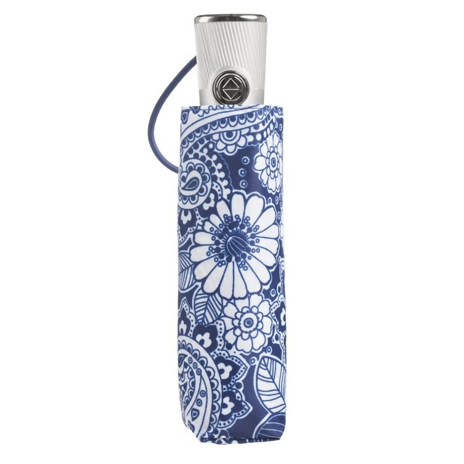 Stay dry and stylish with the Totes Auto Open/Close Mini Folding Umbrella in Nautical Paisley. This umbrella features an innovative invisible coating that ensures rain rolls right off, keeping it four times drier than standard options. Its super lightweight and compact design measures just 8.25 inches when folded, while the canopy spans 39 inches for full coverage. The wide tie strap ensures easy storage, and it comes with an easy-carry wrist strap to add convenience on the go. Care is simple: leave open to dry, and wipe clean with a damp cloth.
