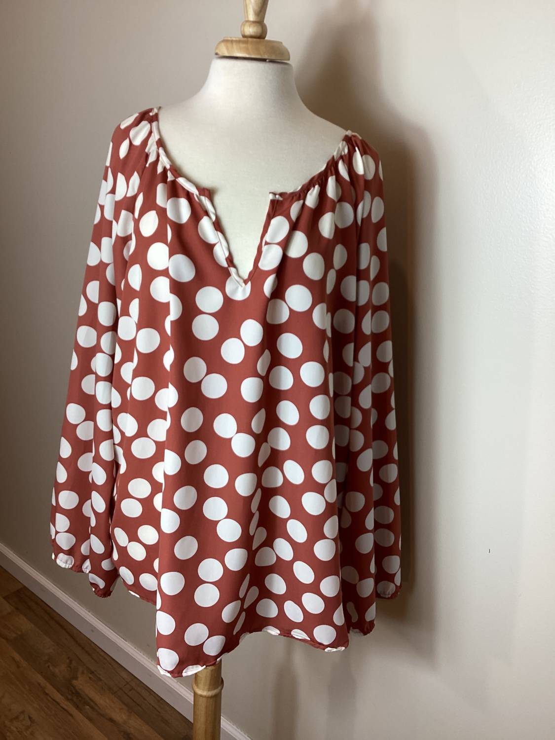 A timeless blouse that will never go out of style. Presenting the Women's Circle Balloon Sleeve Blouse Plus by Beeson River, an elegantly crafted piece in a striking rust and cream geometric pattern. This blouse features long sleeves and a flattering scoopneck, ensuring a chic look that complements any ensemble. Perfect for any occasion, this garment brings a touch of sophisticated style to your wardrobe with its eye-catching design.