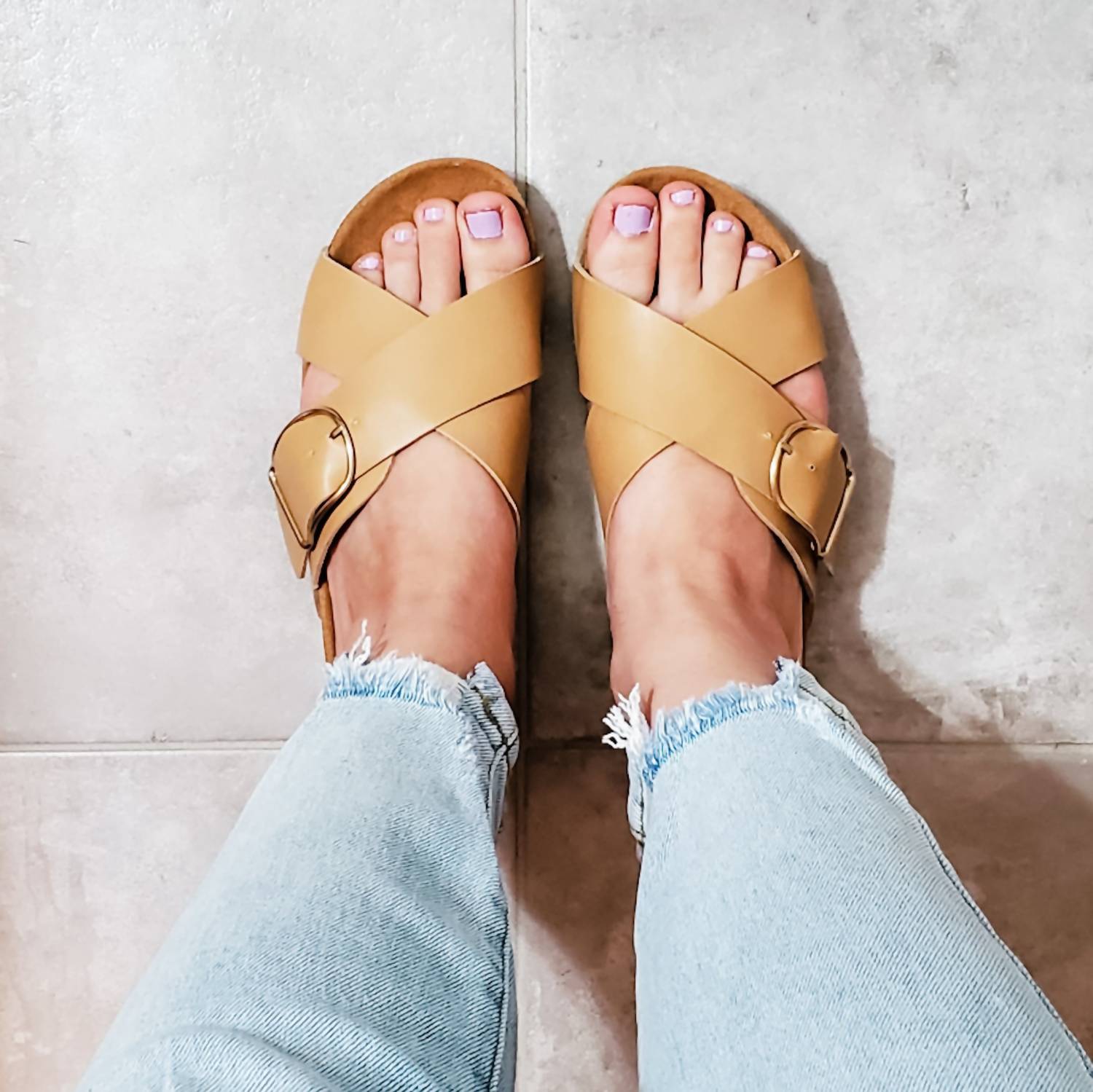 This sandal will take you from brunch to dinner and everything in between. Elevate your summer style with the Women's Buckle X-Band Slip-On Sandals by Qupid, crafted from faux leather in a versatile tan hue. These sandals showcase a chic crisscross design with an adjustable buckle for a secure fit. Featuring an open toe shape perfect for beach days, they provide comfort with a soft suede insole and sturdy rubber bottom. Slip them on effortlessly to complete your laid-back, luxurious look.