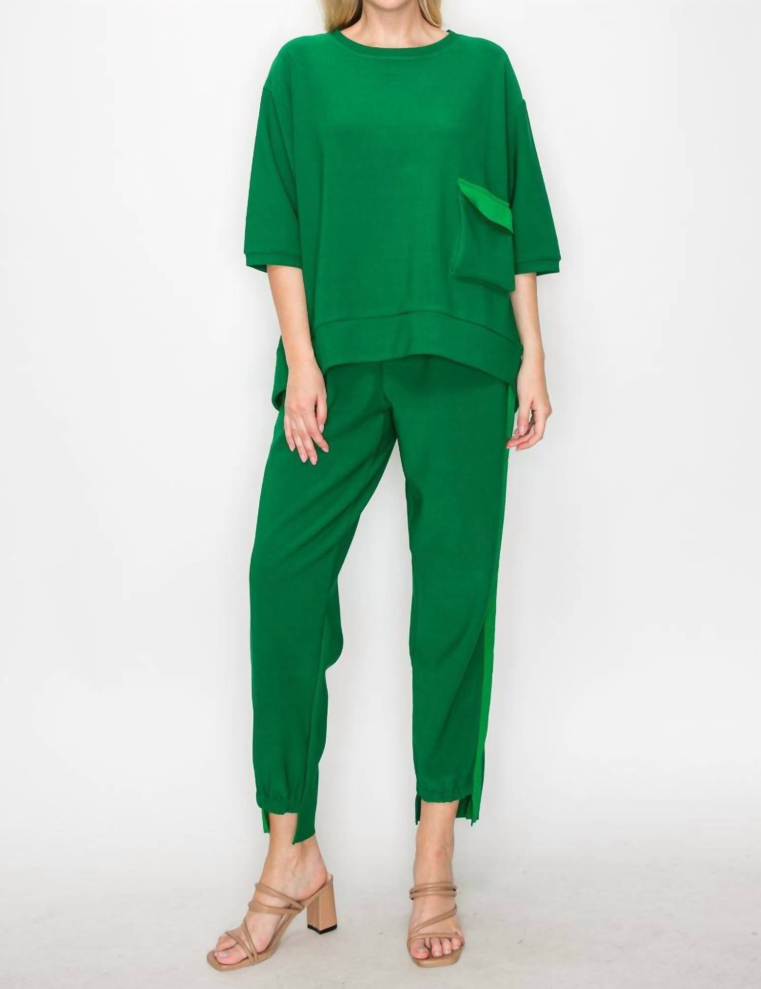 Experience the perfect blend of comfort and style with this trendy crew neck sweater, designed to effortlessly elevate your wardrobe. Pair it with your favorite denim and loafers for the perfect look. Experience the perfect blend of comfort and style with the Karen Knit Crepe Top by Joh in vibrant Emerald. This women's top features a crew neckline and three-quarter sleeves, offering a relaxed oversized fit that is suited for everyday wear. The solid pattern highlights its elegant design, while the convenient front pocket adds a touch of practicality. Closure: Pull on.
