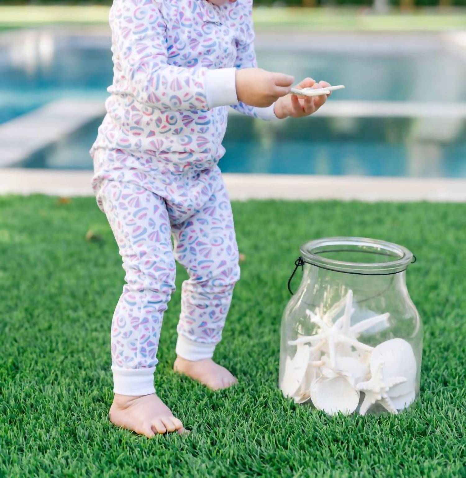 Meet the Girl's Parker Zipper Pajama by lila + hayes, a charming sleepwear choice in the Seashells On The Seashore design. With its zippered closure, this pajama is crafted from 100% Peruvian cotton and offers a snug fit, ensuring comfort and safety for your little one. It's designed with feet for sizes ranging from 0-3 months to 9-12 months, making it ideal for infants. Care for this patterned piece by machine washing with like colors on a delicate cycle in cold water and lay flat to dry, preserving its softness and durability.