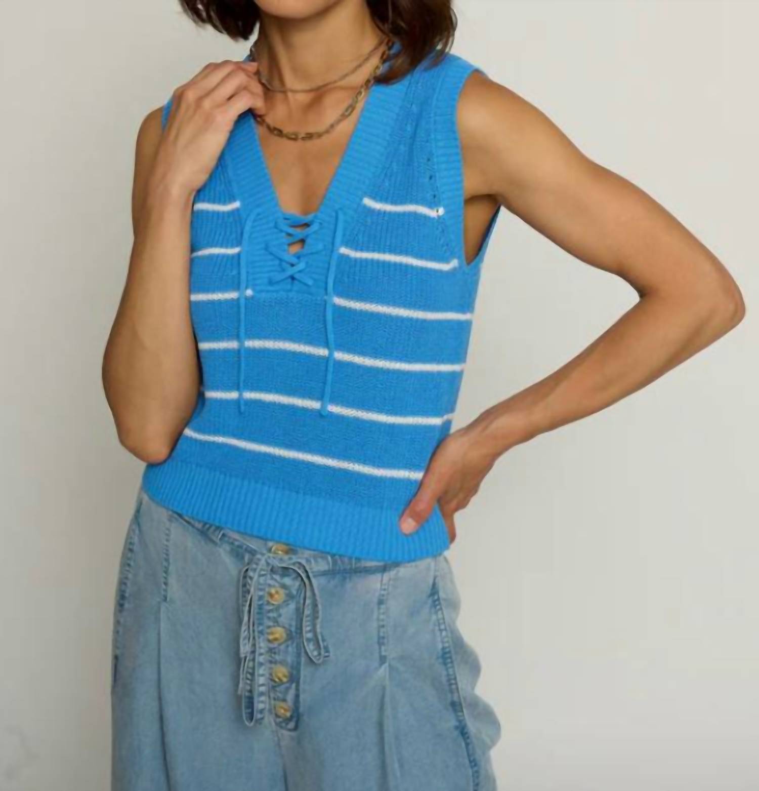 A timeless blouse that will never go out of style. Elevate your summer wardrobe with the Lace Up V-neck Sleeveless Top by Central Park West, ideal for both casual and polished looks. This cornflower-hued top features a sleeveless design with a stylish V neckline and lace-up detailing, complemented by interesting contrast striping. Composed of 97% Cotton and 3% Nylon, this lightweight piece offers a breathable feel—perfect for layering or wearing solo. Closure: Pull on. Care: Hand wash and lay flat to dry.