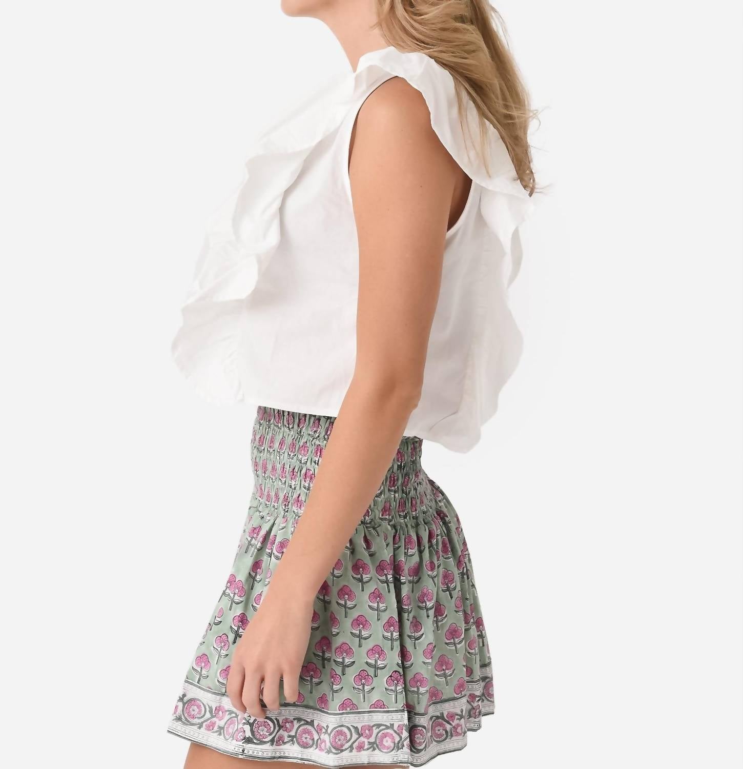 Cotton top with large ruffle sleeves. Round Neckline. Straight Hem. Model is 5'10" wearing size Small top.