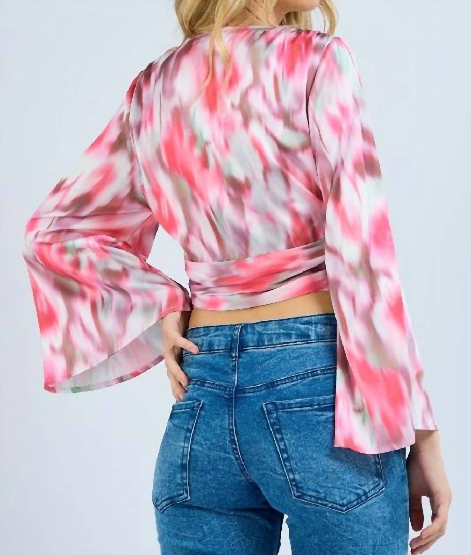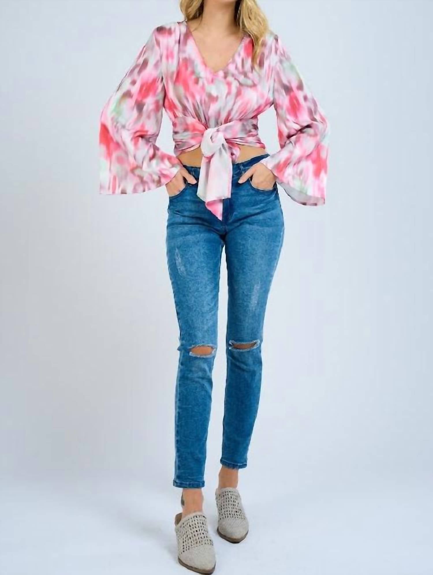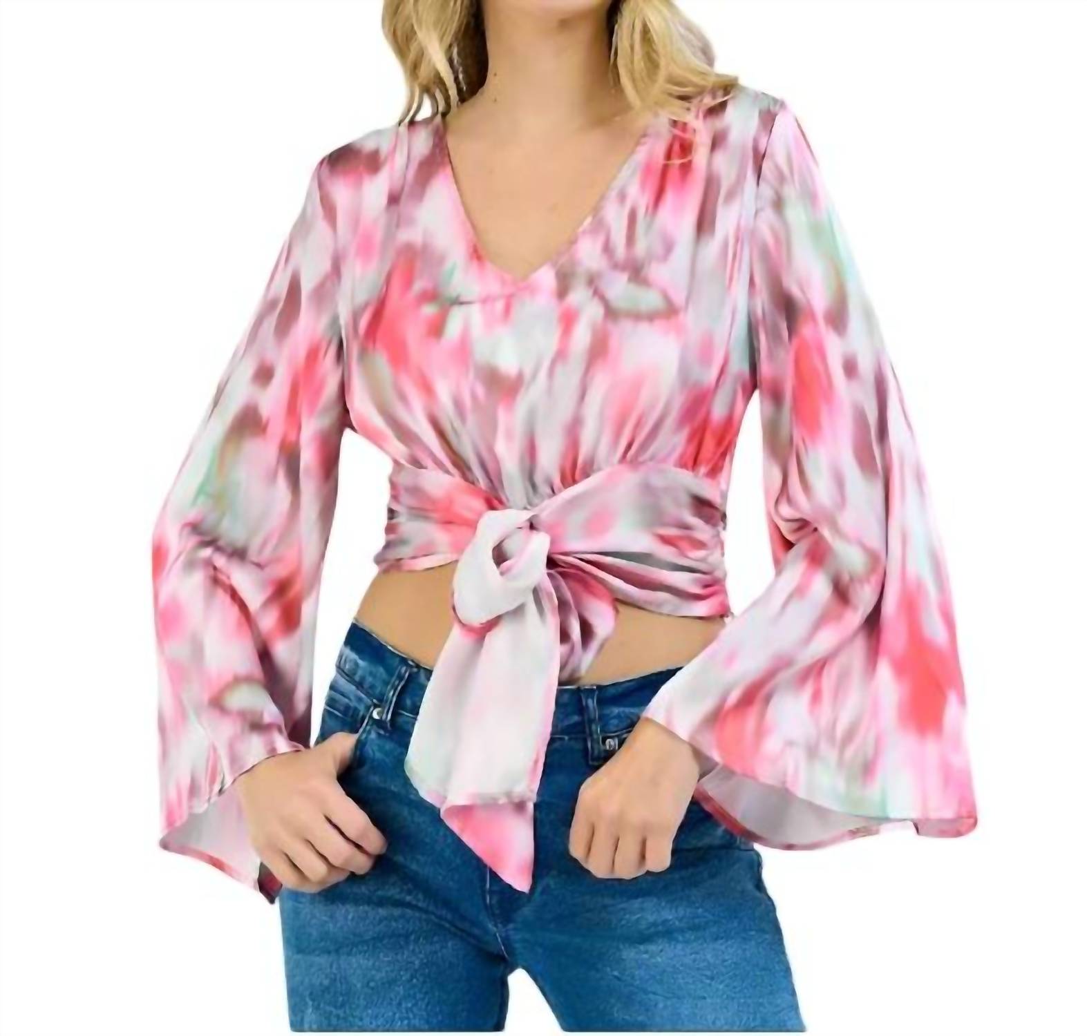 Pair this crop top with your favorite high-waisted jeans or maxi skirt. Elevate your wardrobe with the Bowtie Crop Flare Sleeve Top by LLOVE, a stunning addition in a charming pink tie-dye pattern. This top features long bell sleeves, a V-neck, and a flattering waist bowtie, all on a silky satin fabric. Composition: 97% Polyester, 3% Spandex.