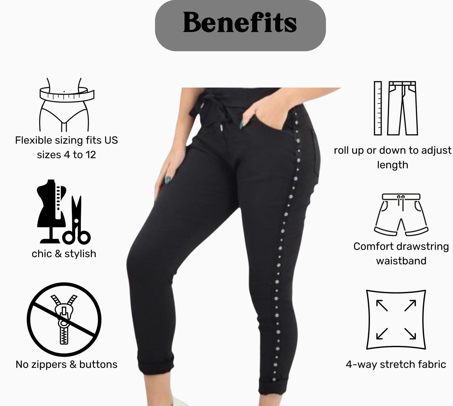 A skinny pant that is both flatering and comfortable. We love this style because it works great with boots, or without! Introducing the Dreams Italian Magic Pants by Made in Italy, a perfect blend of chic sophistication and everyday comfort. These women's skinny leg pants feature a mid-rise fit, crafted in a soft cotton blend with elegant lavender hues, and crafted in Italy. With functional details including two side pockets and a convenient front tie closure, they are ideal for casual occasions. The inseam is 29", and they can be easily maintained with machine washing and tumble drying.