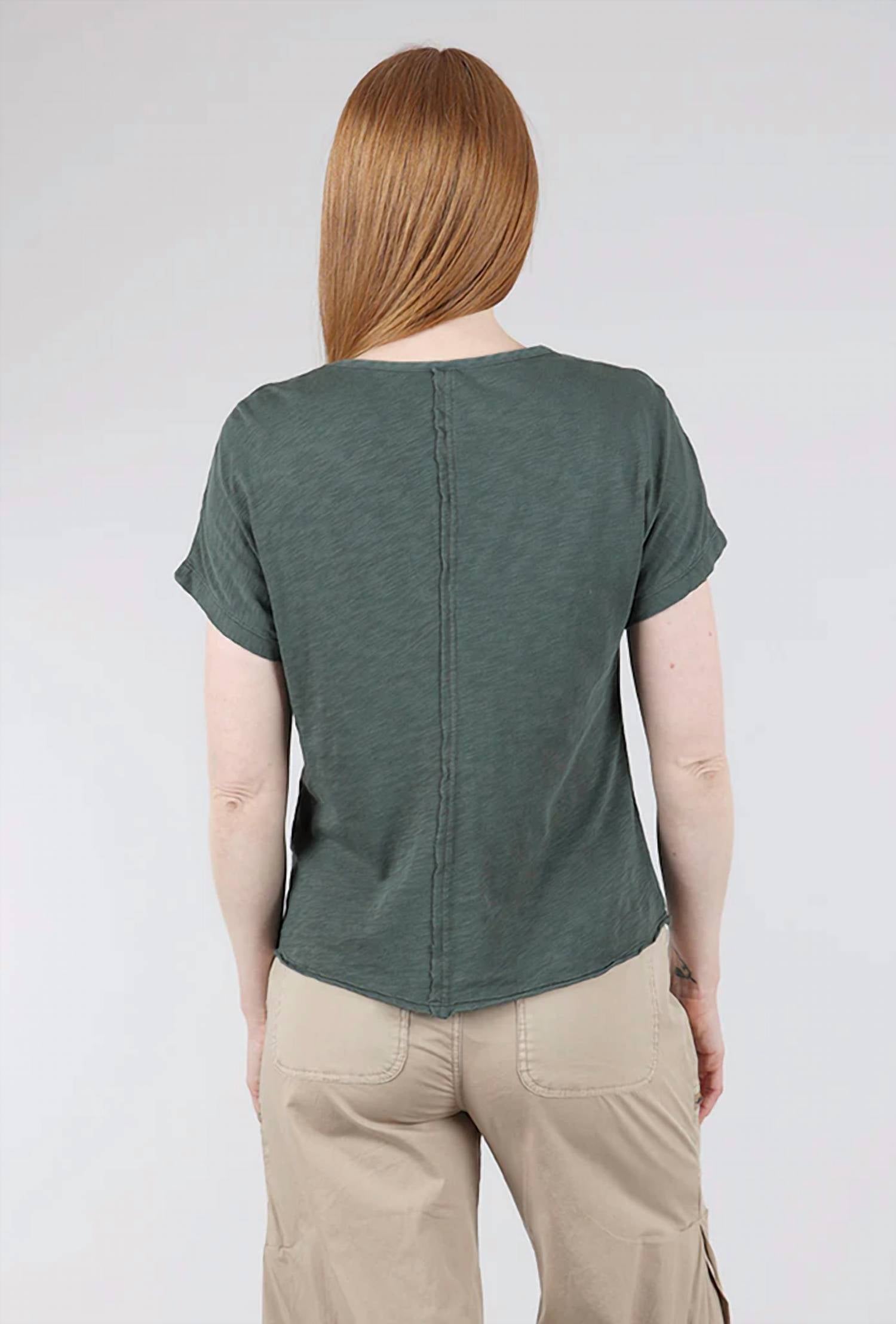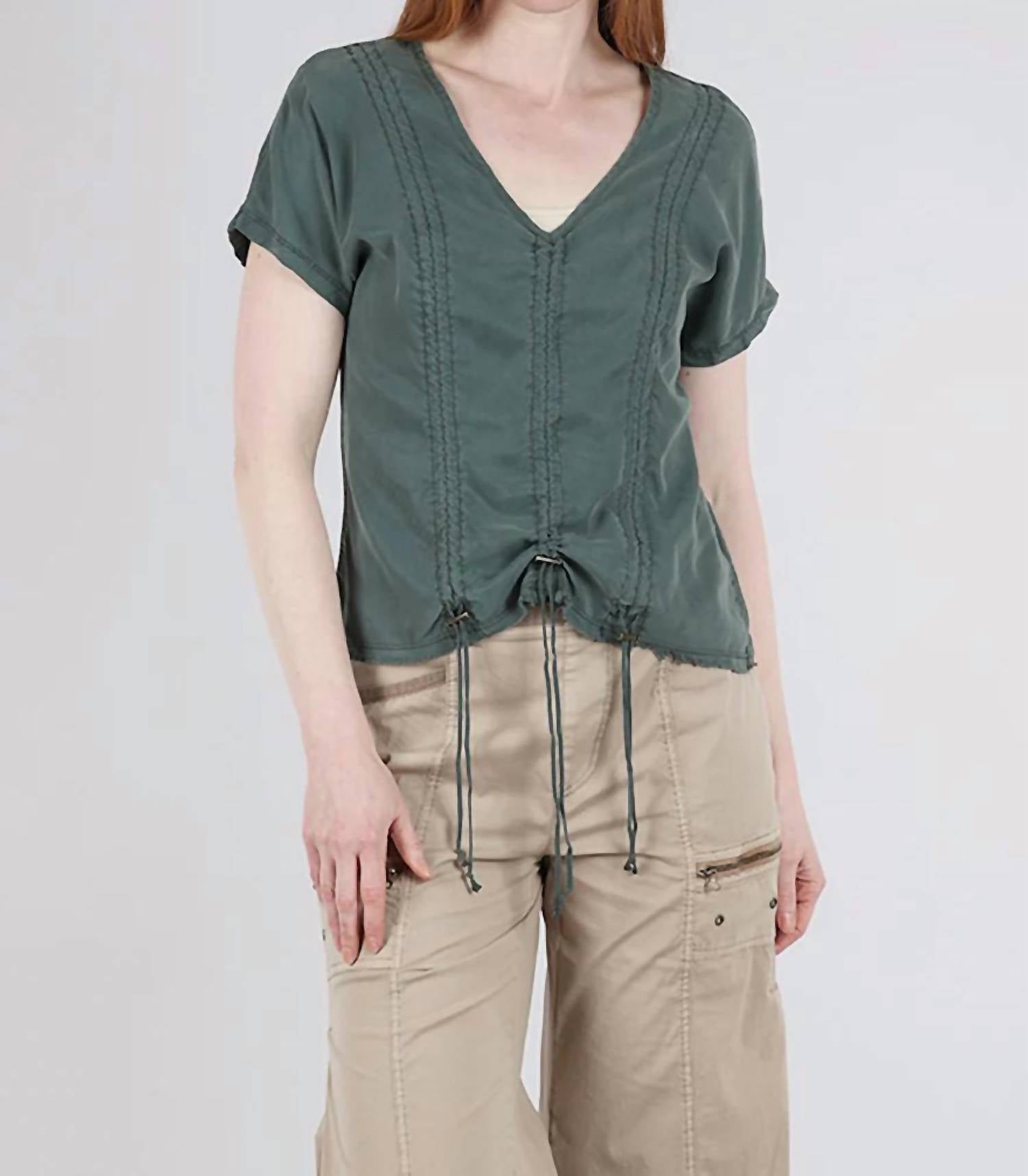 This classic, short sleeve tee will be your go-to staple this season and beyond. Explore effortless style with the Werner Top by XCVI, a chic minimalist piece in elegant Silken Pine. This relaxed v-neck tee offers short sleeves and a lightly cropped boxy fit, enhanced with three adjustable corded channels for a unique look. Crafted from soft twill with 100% Tencel and a cotton-modal slub jersey contrast, this top measures approximately 14.25" at the center front and 22.75" at the back. This travel-ready, solid-patterned piece is pull-on in style, preshrunk for convenience, and machine washable.