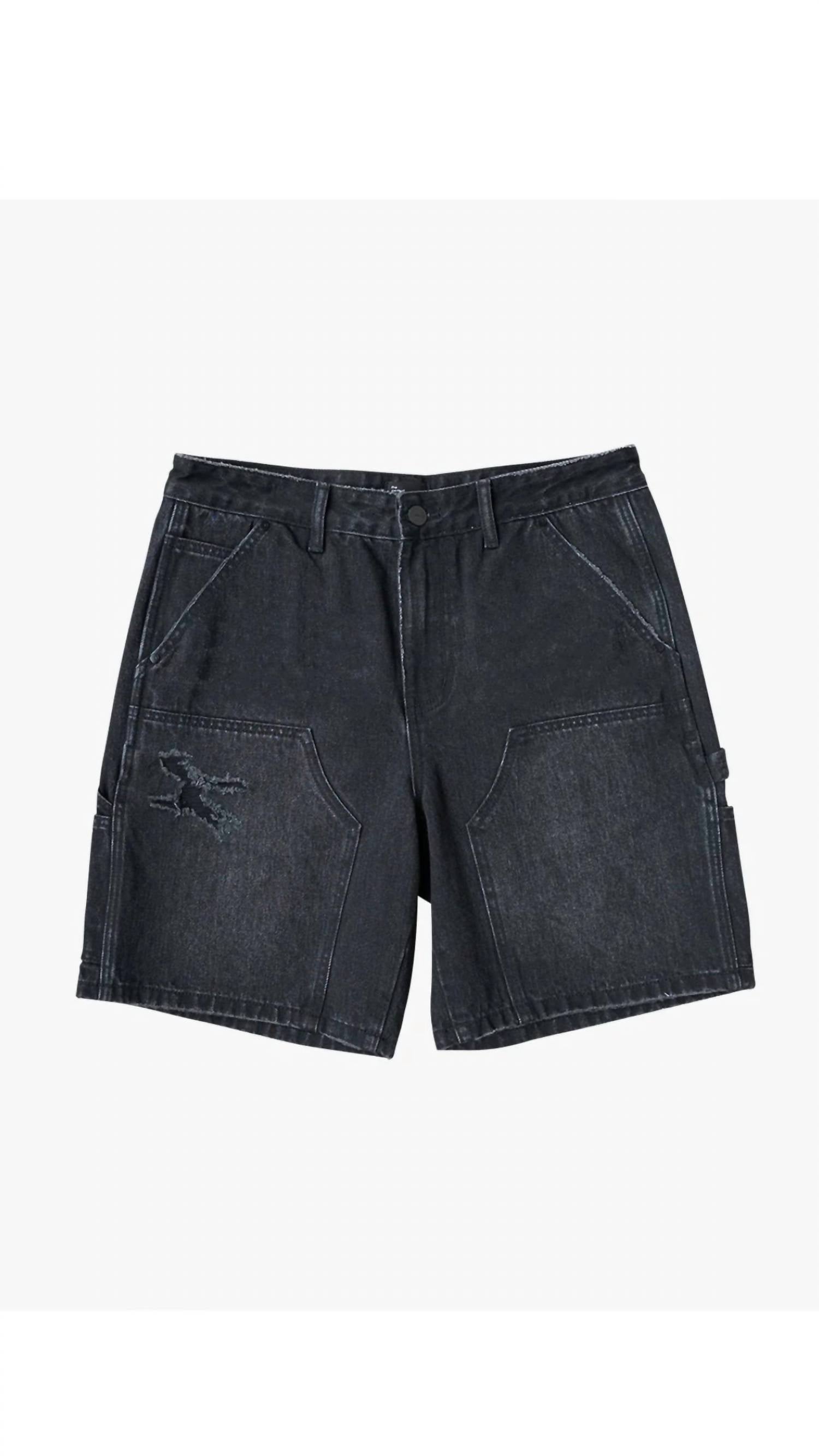 Experience effortless style and comfort with EPTM's Double Knee Denim Shorts in Black Wash. These men's jean shorts showcase a relaxed fit, front knee paneling, and functional carpenter pockets, embodying a minimalist trend perfect for casual spring occasions. Made from 100% cotton, they feature a solid pattern and a zip closure for easy wear. Machine wash for maintained quality.