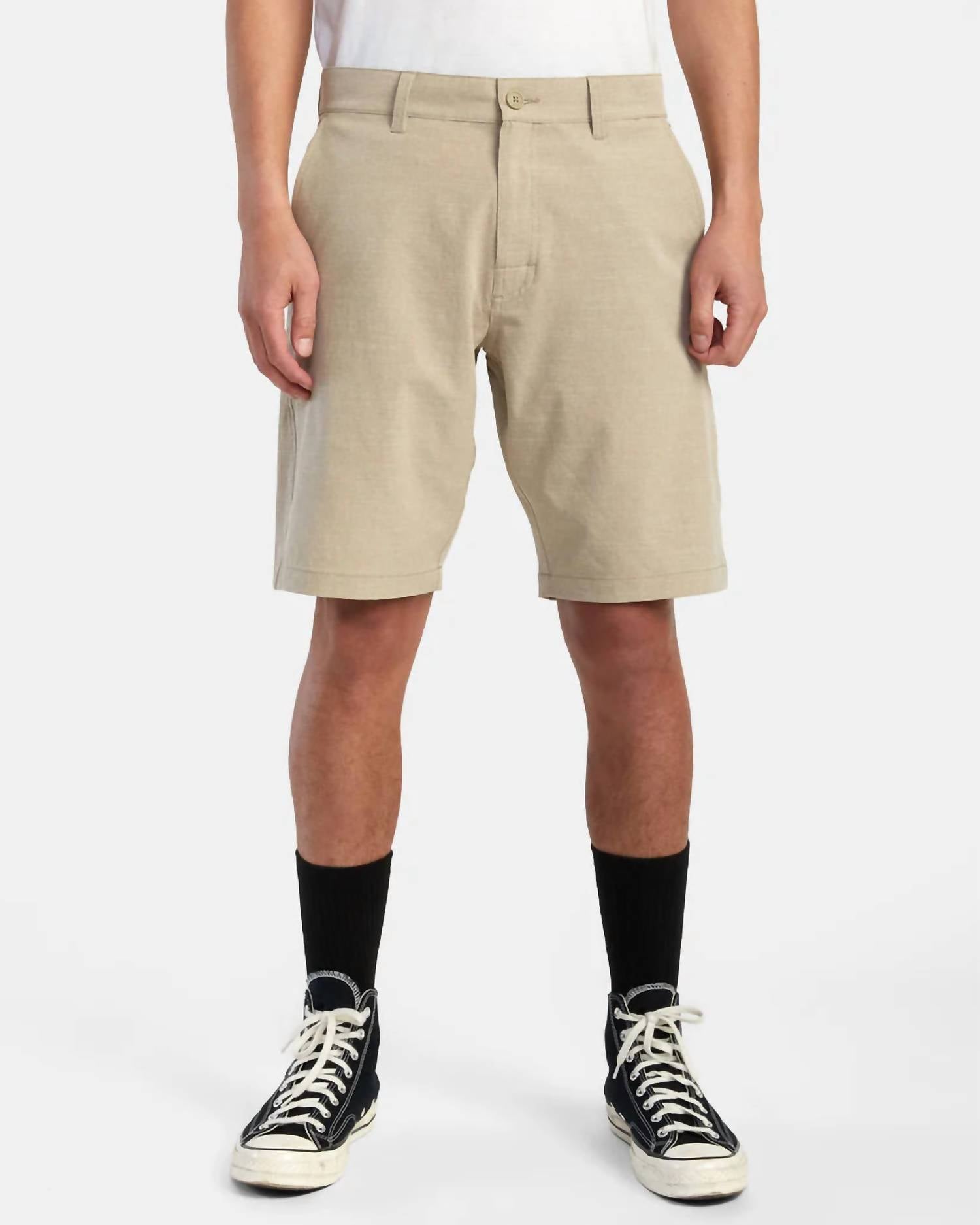 Introducing the Balance Hybrid 20 Shorts by RVCA, crafted for the modern adventurer in a versatile khaki hue. These men’s shorts feature a regular fit with an outseam of 20 inches and are made from a 4-way stretch polyester blend with a DWR coating for water resistance and comfort. Designed with functionality in mind, they include a silicone hybrid button closure, back left pocket with reverse coil zip, and back right welt pocket with pull tabs. Composition: 78% Polyester, 13% Cotton, 9% Elastane. Care: Machine wash.