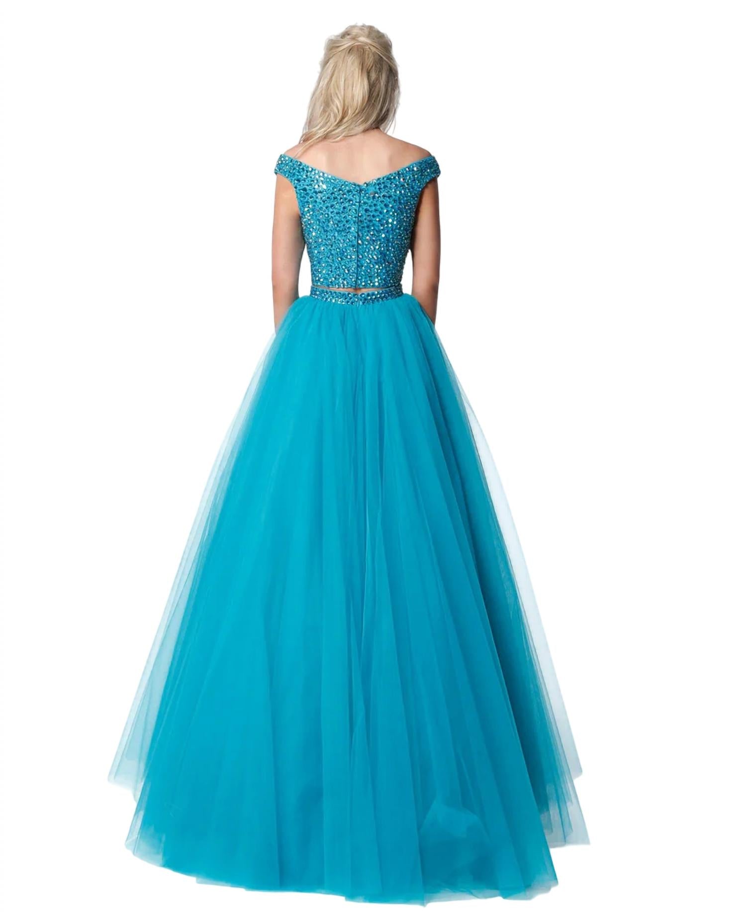 Features a two piece. beaded. V-neck bodice. Tulle A-line skirt. Floor-length.