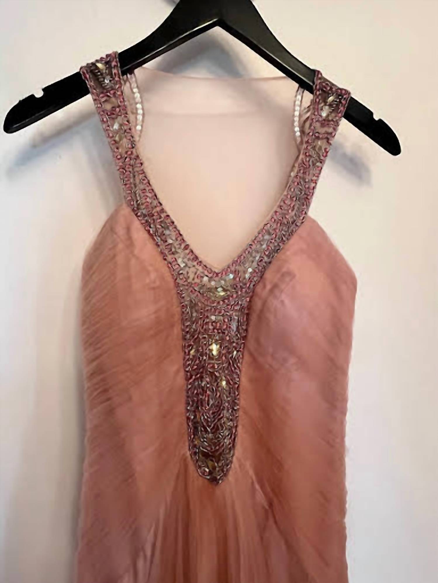 V-neckline. Mesh fabric for the whole dress. Has beading on the neckline. Comfortable and flowy fit. Lined.