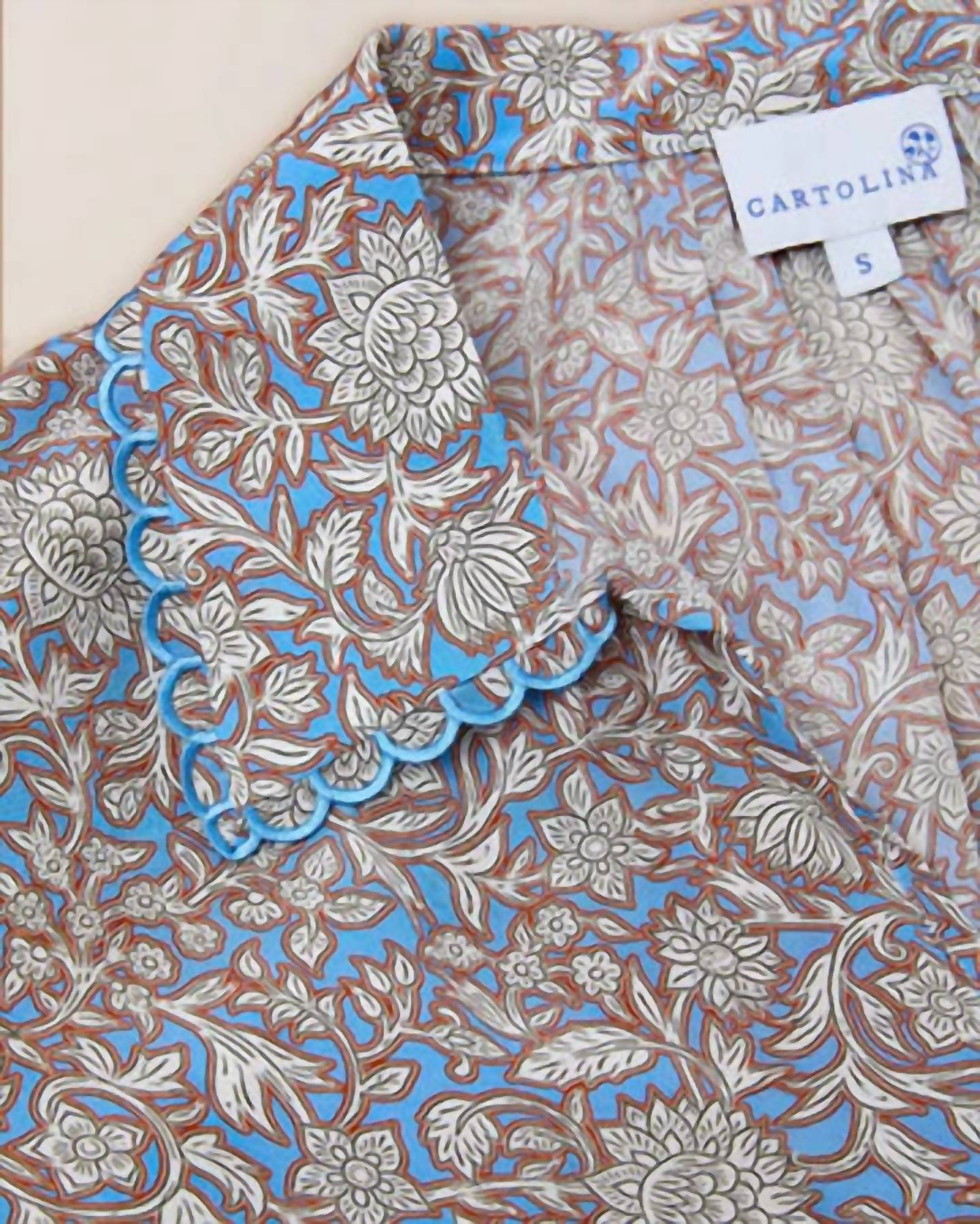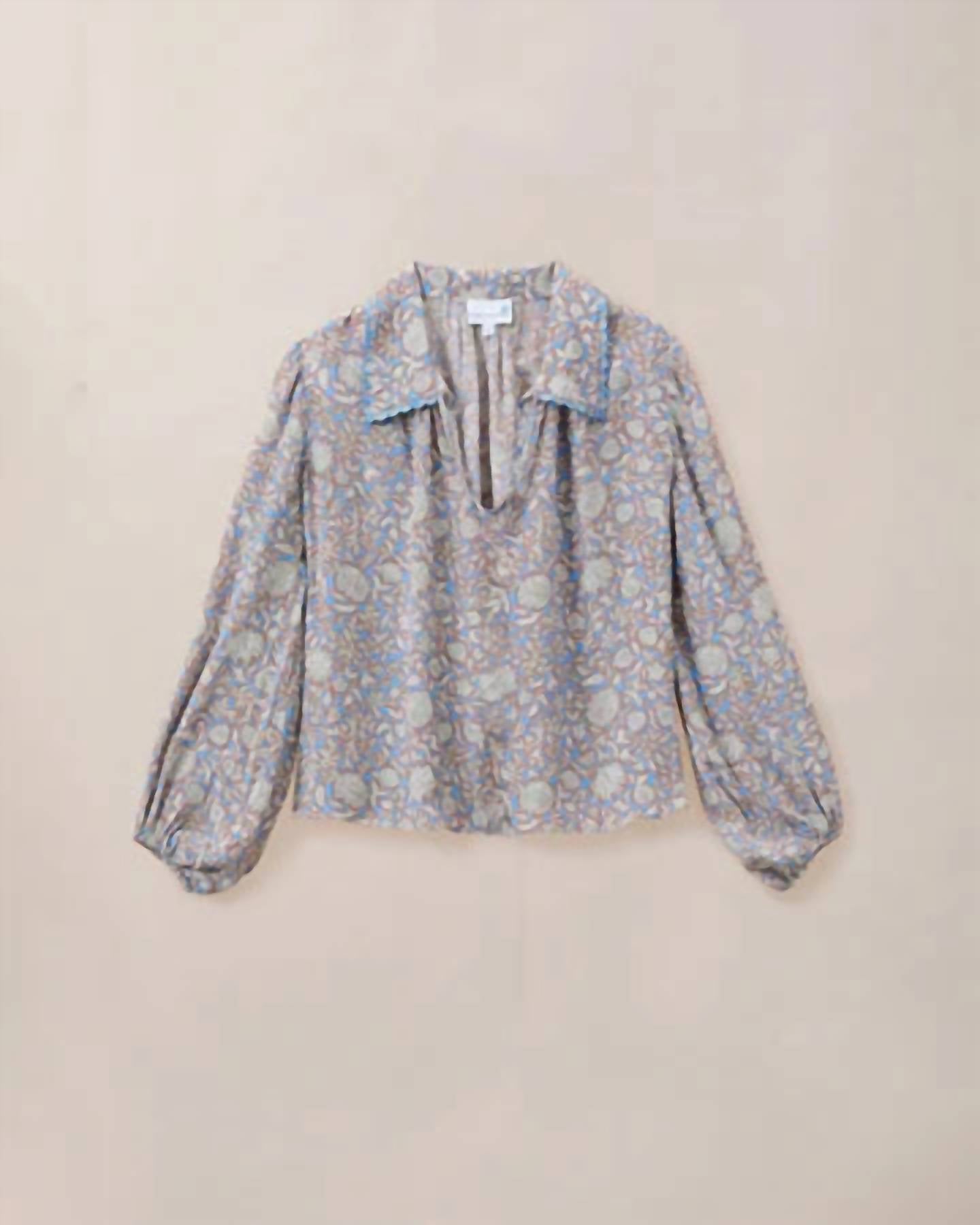 A timeless blouse that will never go out of style. The Seneca Top by Cartolina Nantucket, in Boboli Garden Hydrangea Blue, is a fluid masterpiece crafted from 100% Viscose for a gentle drape. Its long sleeves and scalloped collar detail add elegance, while the pull-on closure ensures ease of wear. This blouse's floral pattern complements its relaxed silhouette, perfect for enhancing movement and style. Care for this exquisite piece by dry cleaning it only.