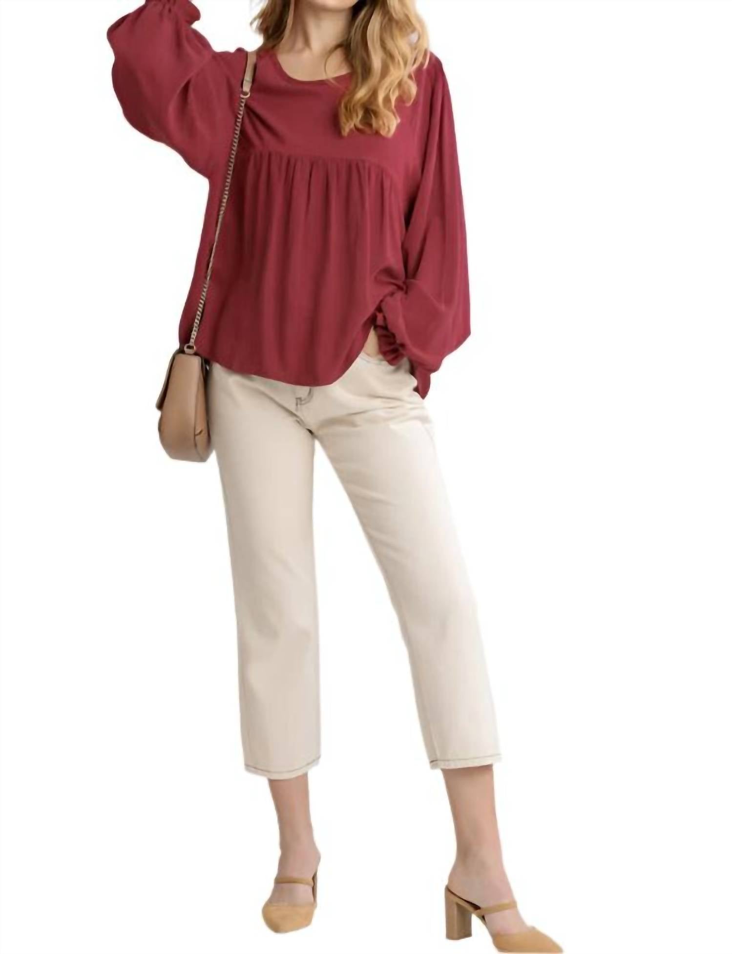 A versatile blouse that works from desk to dinner! Introducing the Pleated Detail Babydoll Top by Umgee, a charming addition to your wardrobe in a rich burgundy hue. Crafted with long bubble sleeves and featuring a babydoll cut, this top provides a flowy, oversized A-line silhouette perfect for pairing with jeans and booties. Composition: 55% Linen, 45% Rayon. Country of Origin: Imported. Closure: Pull-on style. Care: Hand wash. Garment length measures 27 inches, with bust measurements available for sizes Small (40"), Medium (42"), and Large (44").