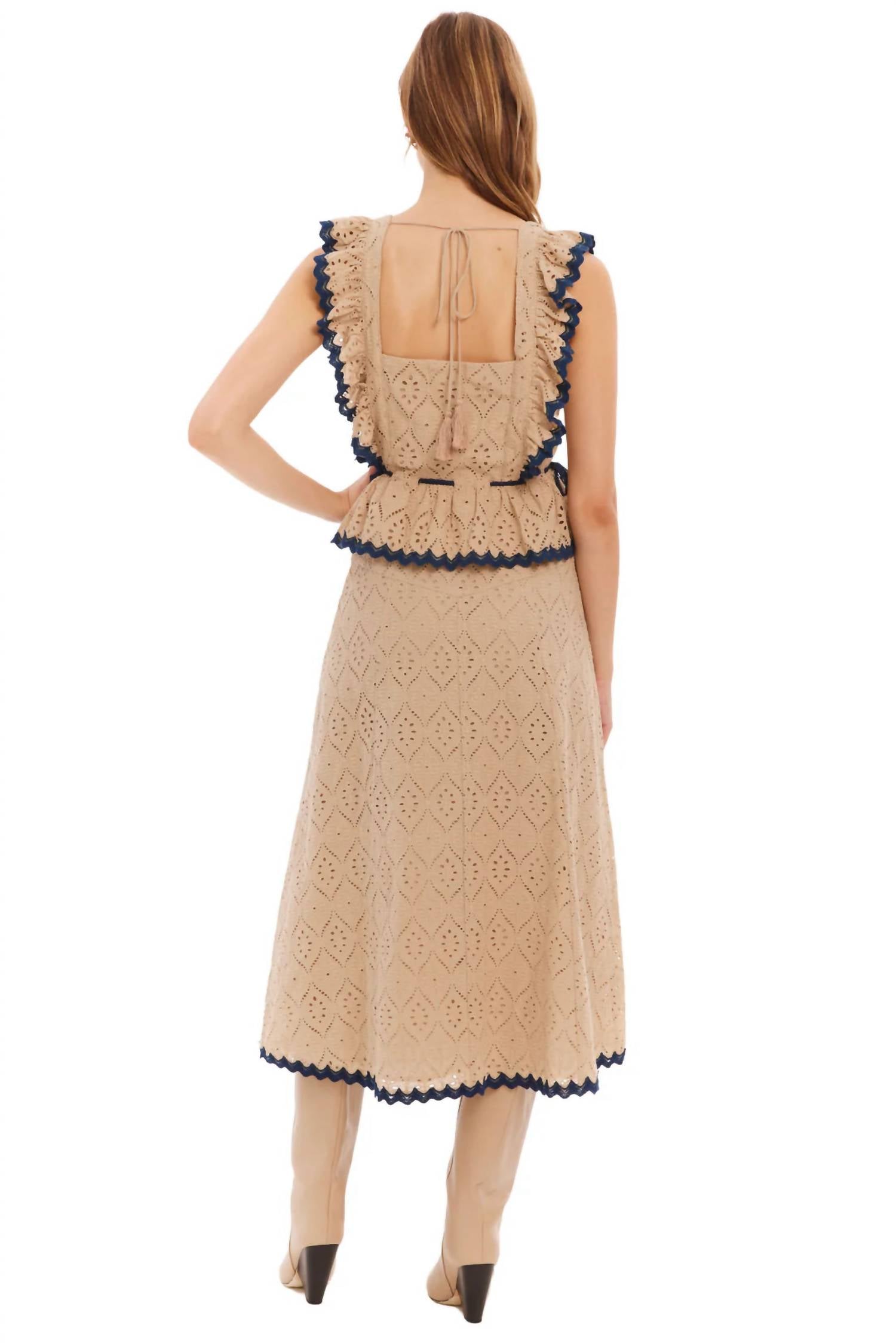 This classic tank top is perfect for layering and cute enough to wear on its own. For a feminine touch, the Callie Top has arrived. Cut in a soft sand colorway on eyeleted cotton and adorned with contrasting lace trims throughout. Designed with a straight neckline leading to a ruffled shoulder that ties at the back for added support. Cinch in at your waist with an adjustable lace drawstring, creating a peplum shape. Side zipper closure and fully lined.