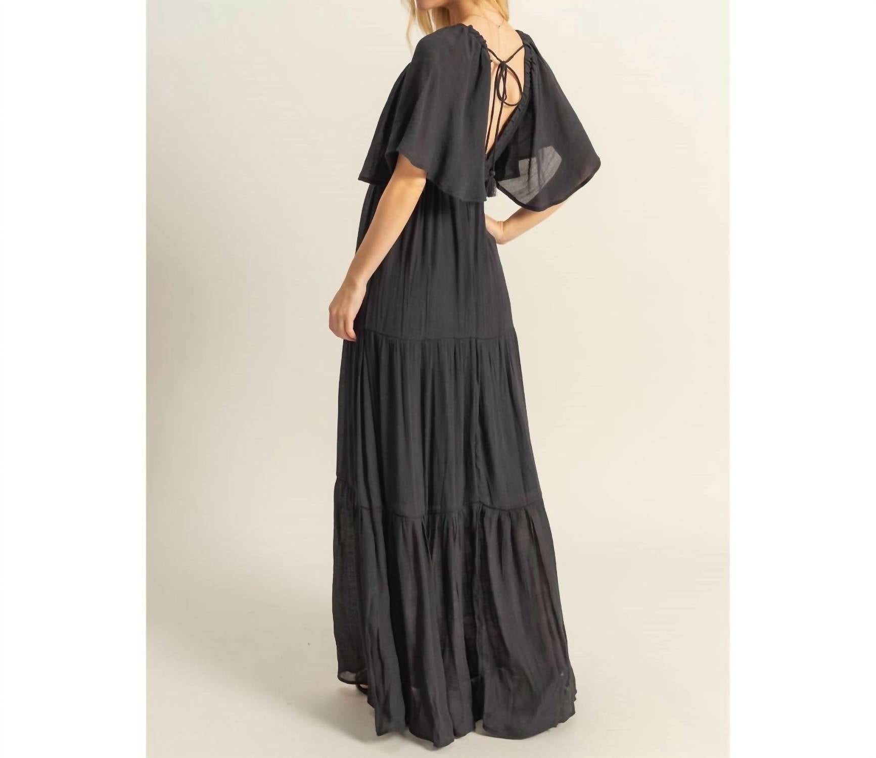 Style this maxi with your favorite statement necklace and sandals for the perfect look. Introducing the V-neck Flowy Sleeves Maxi Dress by HYFVE, an elegant choice for evening events in timeless black. This dress features short flowy sleeves with banded detailing, leading to a plunging V-neckline. Made from 100% polyester, it boasts a tiered, maxi A-line silhouette. Closure: Pull on. Care: Machine wash and tumble dry.
