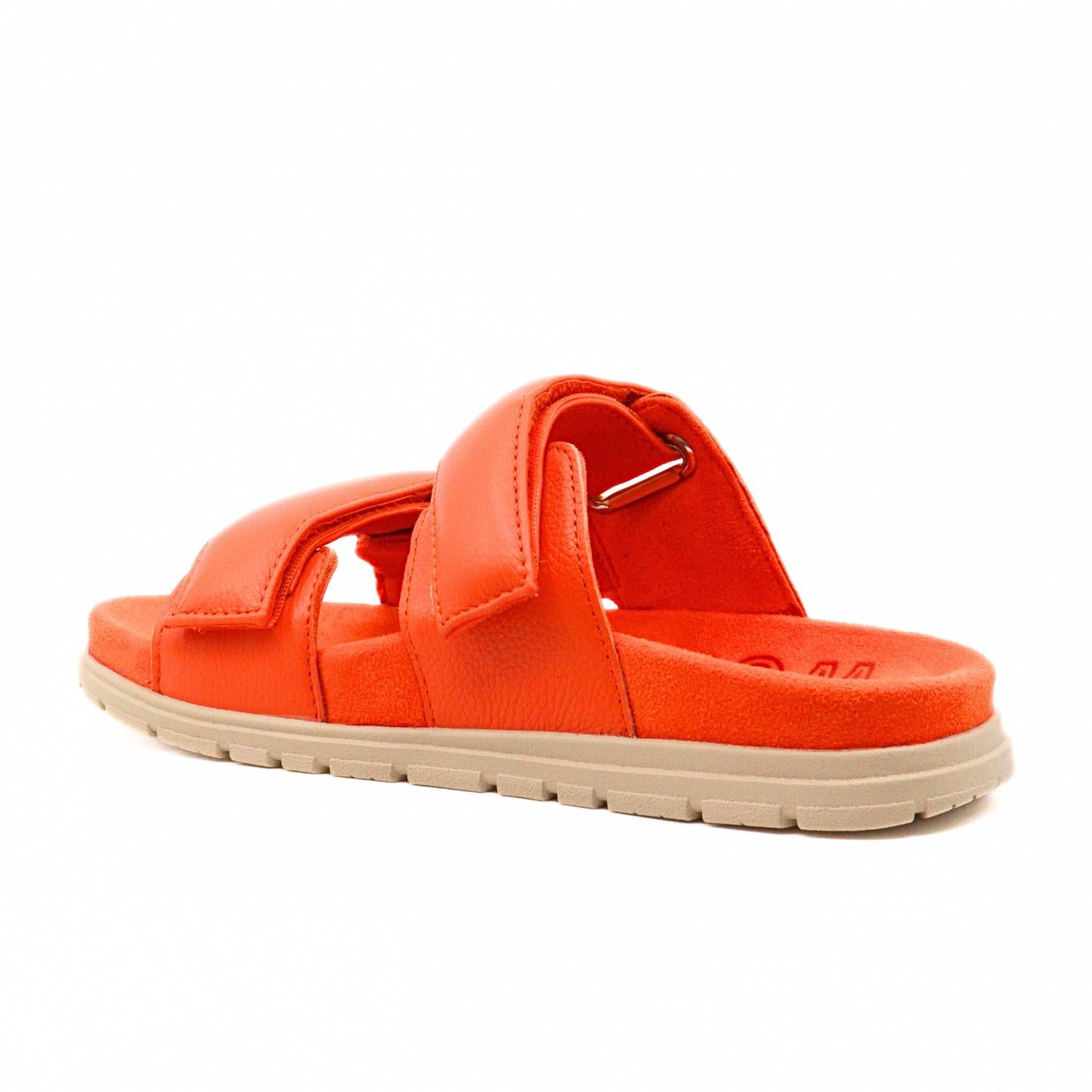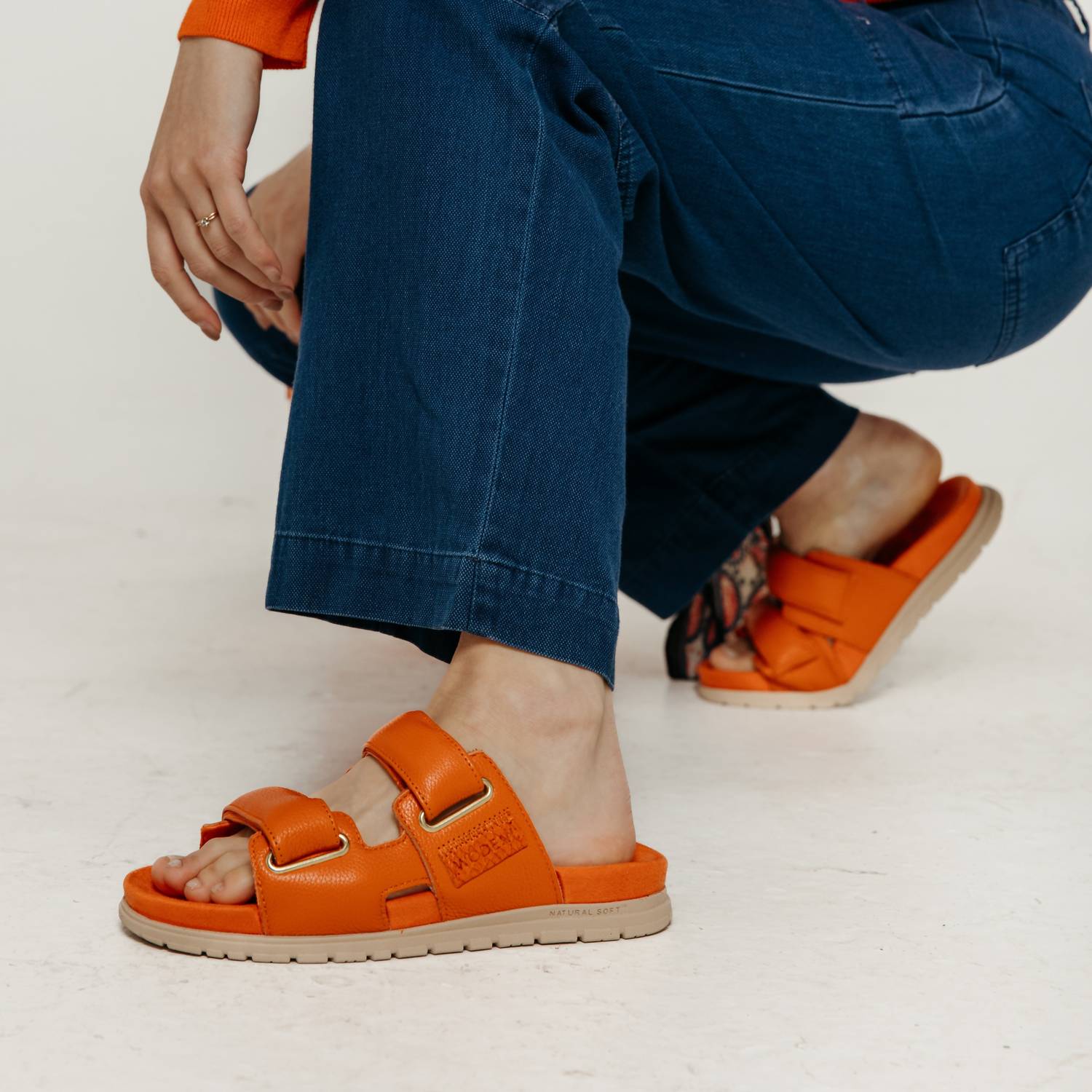 Flowy dresses, cropped pants, and even jumpsuits... this sandal works with them all! Step into summer with the Women's Lisa Leather Sandal by Woden, an open toe design perfect for vacations in vibrant Tiger color. Crafted with leather and featuring flat heels, these sandals offer a comfortable, adjustable fit with two Velcro straps. The grippy rubber outsole and footbed that molds to your foot ensure easy slip-on as you're on the go, making them ideal for your summer adventures. Designed for women, these are the ultimate go-to accessory for the season.