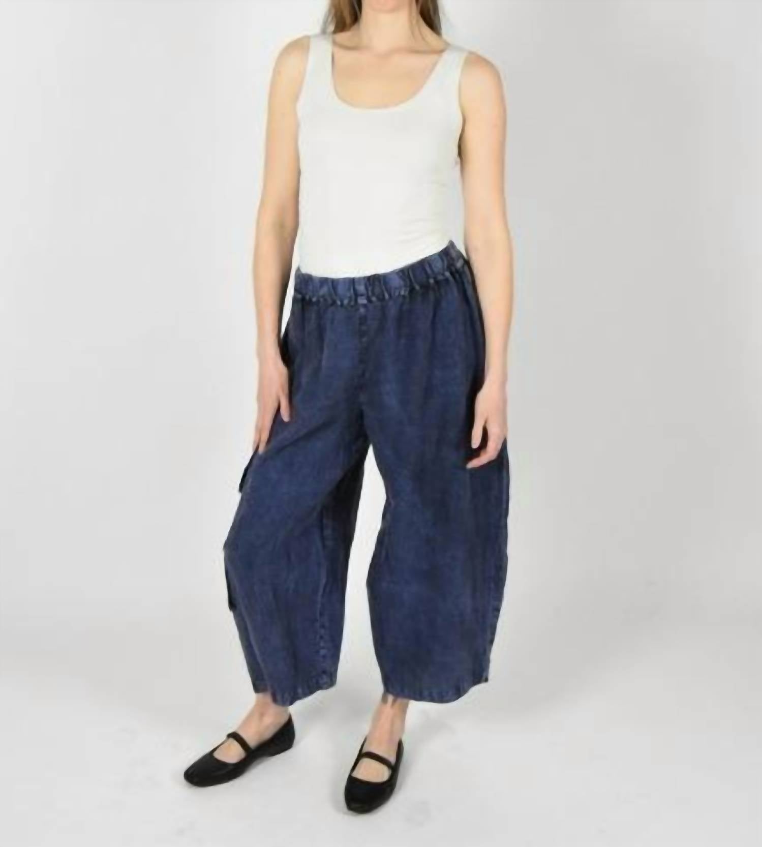 Meet the Corina Pants by Beau Jours, a must-have for your summer wardrobe in a sophisticated Eclipse shade. These wide-leg pants boast a cropped garment length of 34 inches and feature a relaxed fit with a pull-on closure for easy wear. Crafted from 100% linen, they feature an inseam of 24 inches and a rise of 9.75 inches (size XS), with practical side cargo pockets to enhance their casual-cool style. Made in the USA, these pants are perfect for summer adventures and are best cared for with a hand wash and tumble dry on low.