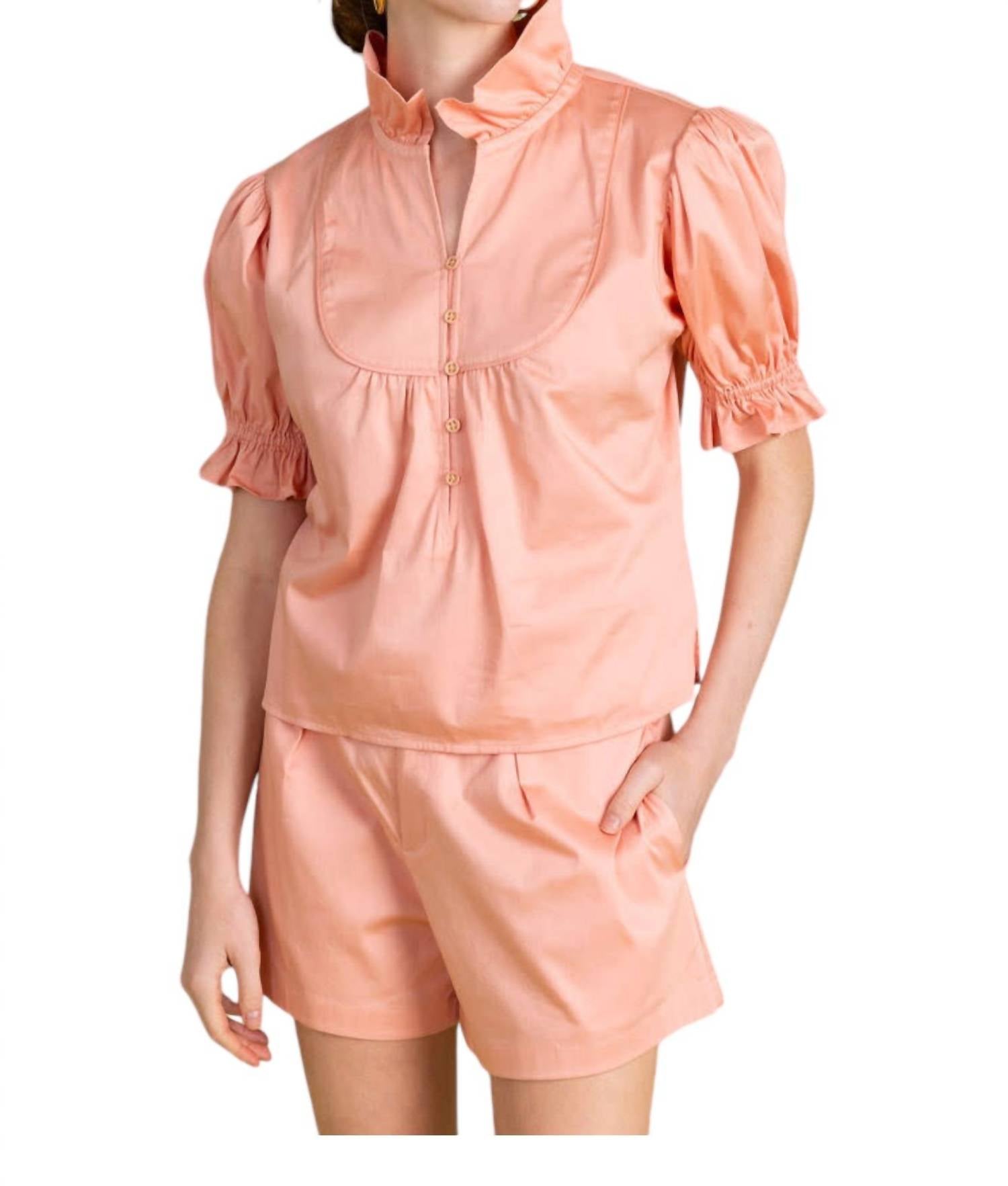 Short sleeve blouse. Bib front. High collar. 98% Cotton 2% Spandex.