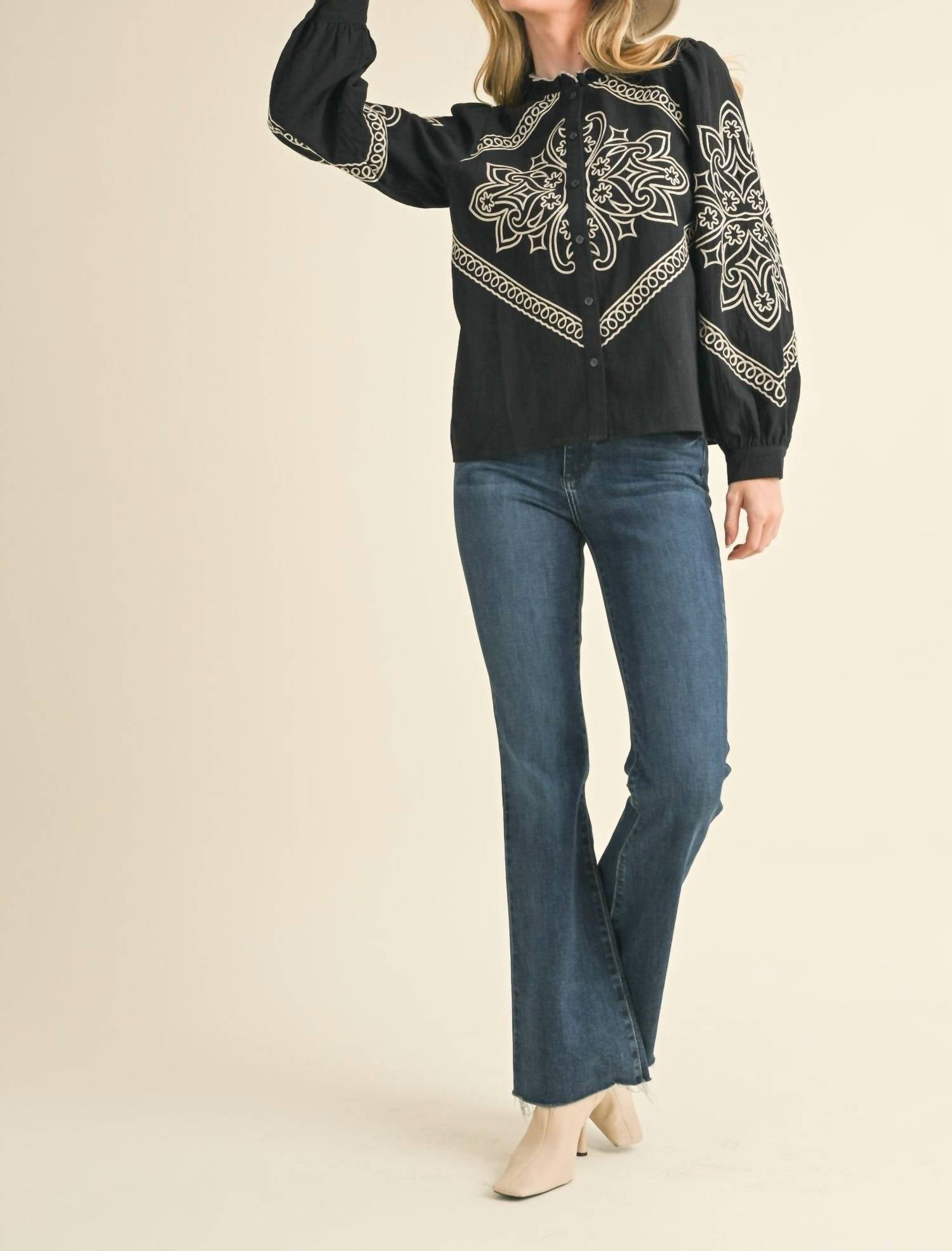 A classic button down shirt that will never go out of style. Crafted to refine your style with elegant detailing. Flaunts long puff sleeves with buttoned cuffs and a charming ruffled mock neckline. Adorned with delicate embroidery on the front and sleeves. Made entirely from 100% cotton. Button-up top ensures a luxurious feel. Experience sophisticated fashion.