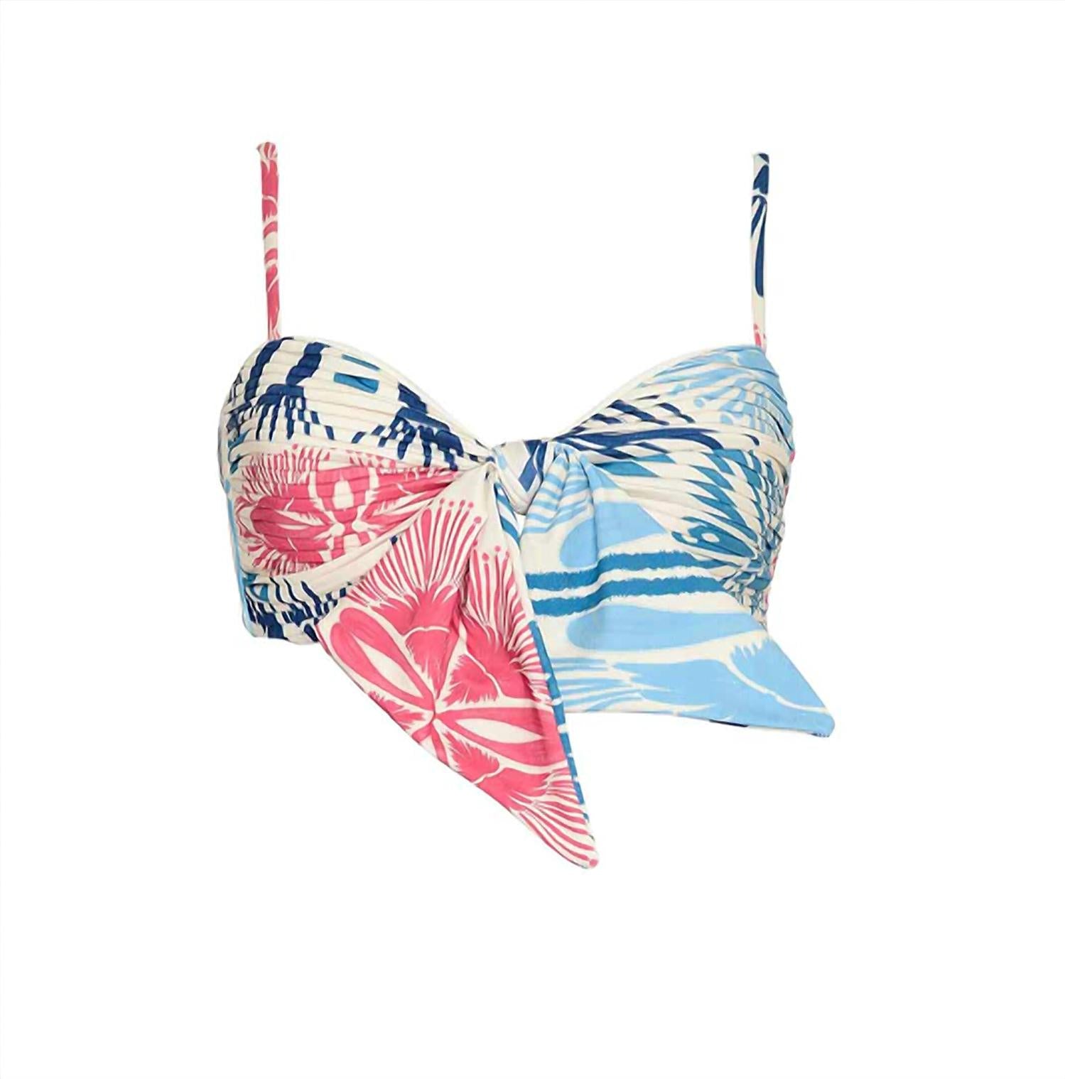 Dream of your next beach getaway in this cute little number. Pair with strappy sandals, a floppy hat, and an oversized tote to complete the perfect vacation look. Put your beach look in the spotlight with the Briana Costa Bikini Top. This bandeau-style piece is designed with pleated details and adjustable straps for a comfortable fit and support. A subtle tie knot at the center adds an elegant touch, while removable pads create a customizable look. Material: 82% polyester, 18% elastane. Lining: 78% polyester, 22% elastane.