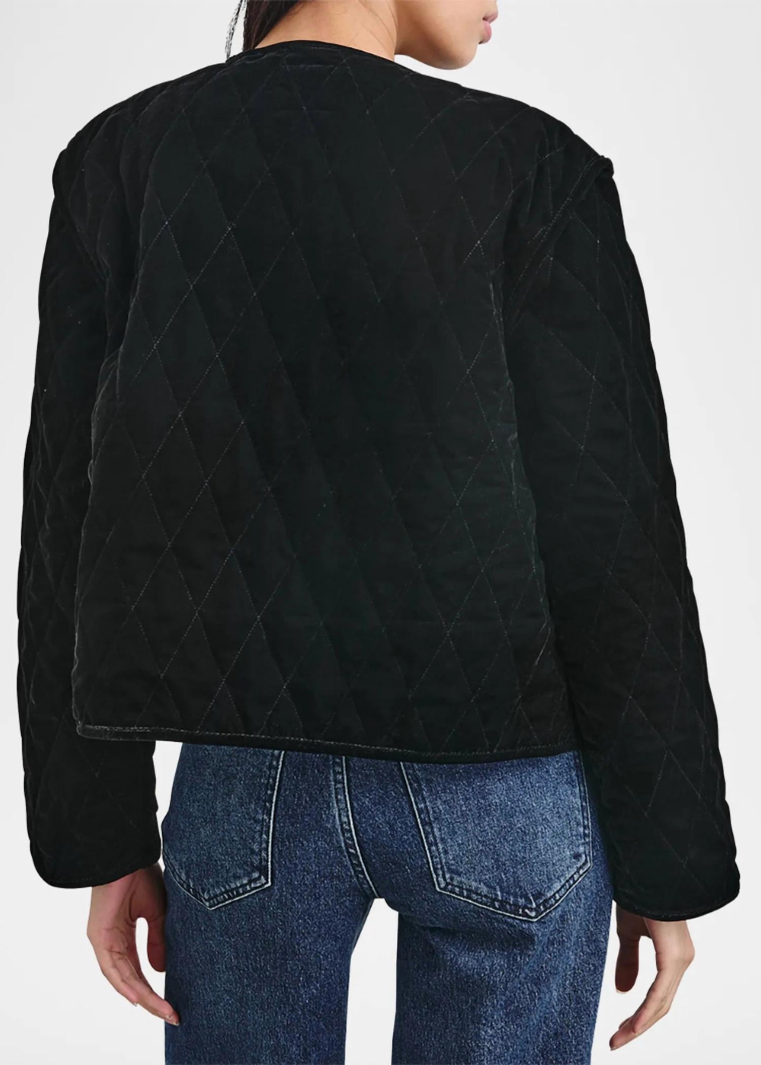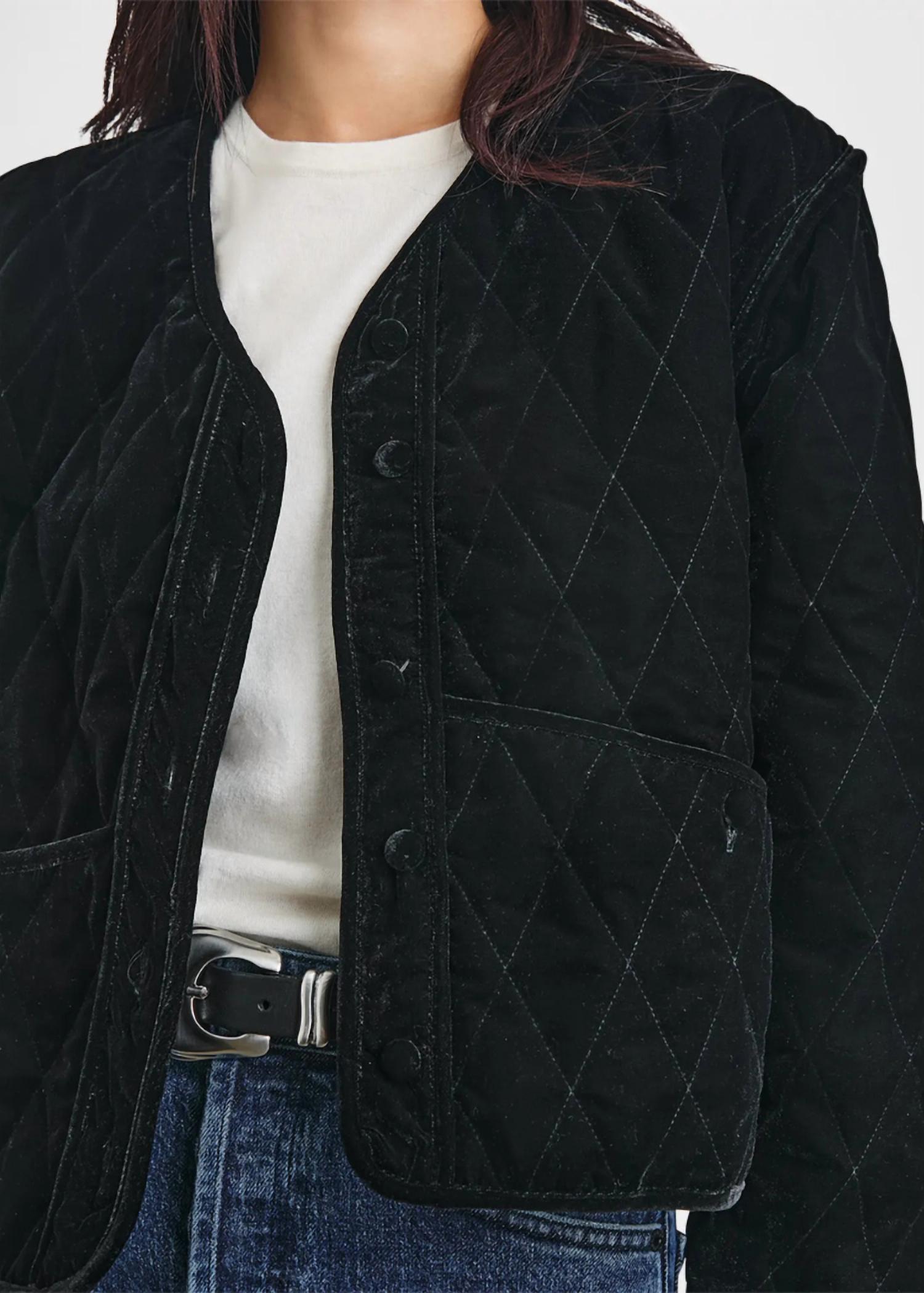 Quilted design. Approx. 23.5" length. V neckline. Button front. Long sleeves. Front slip pockets. Hip length. Relaxed fit. Viscose/nylon/polyamide blend. Polyester lining and fill. Dry clean. Imported.