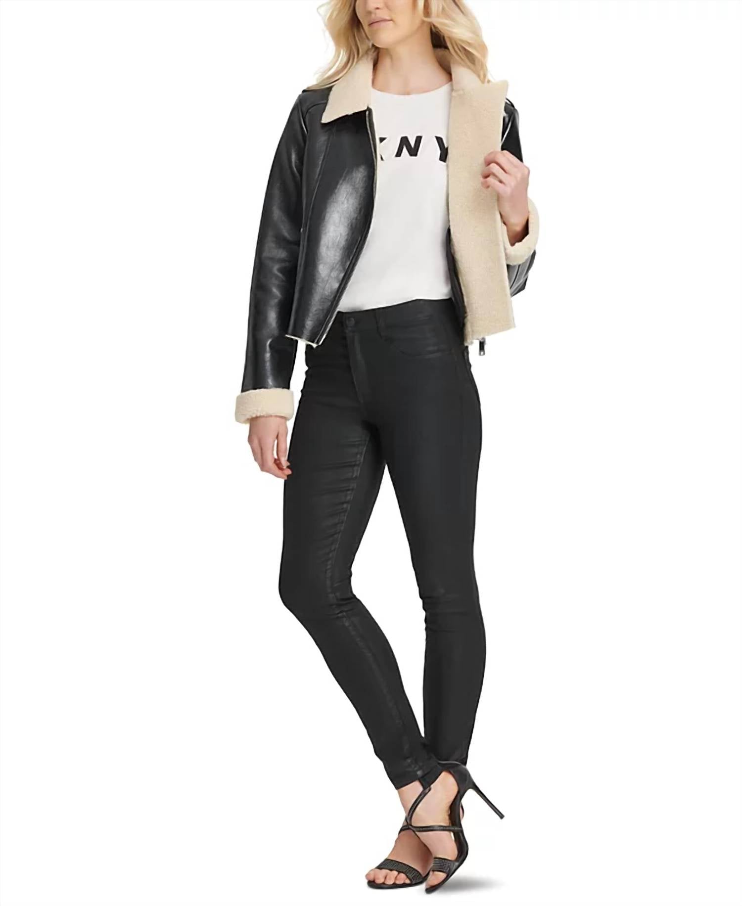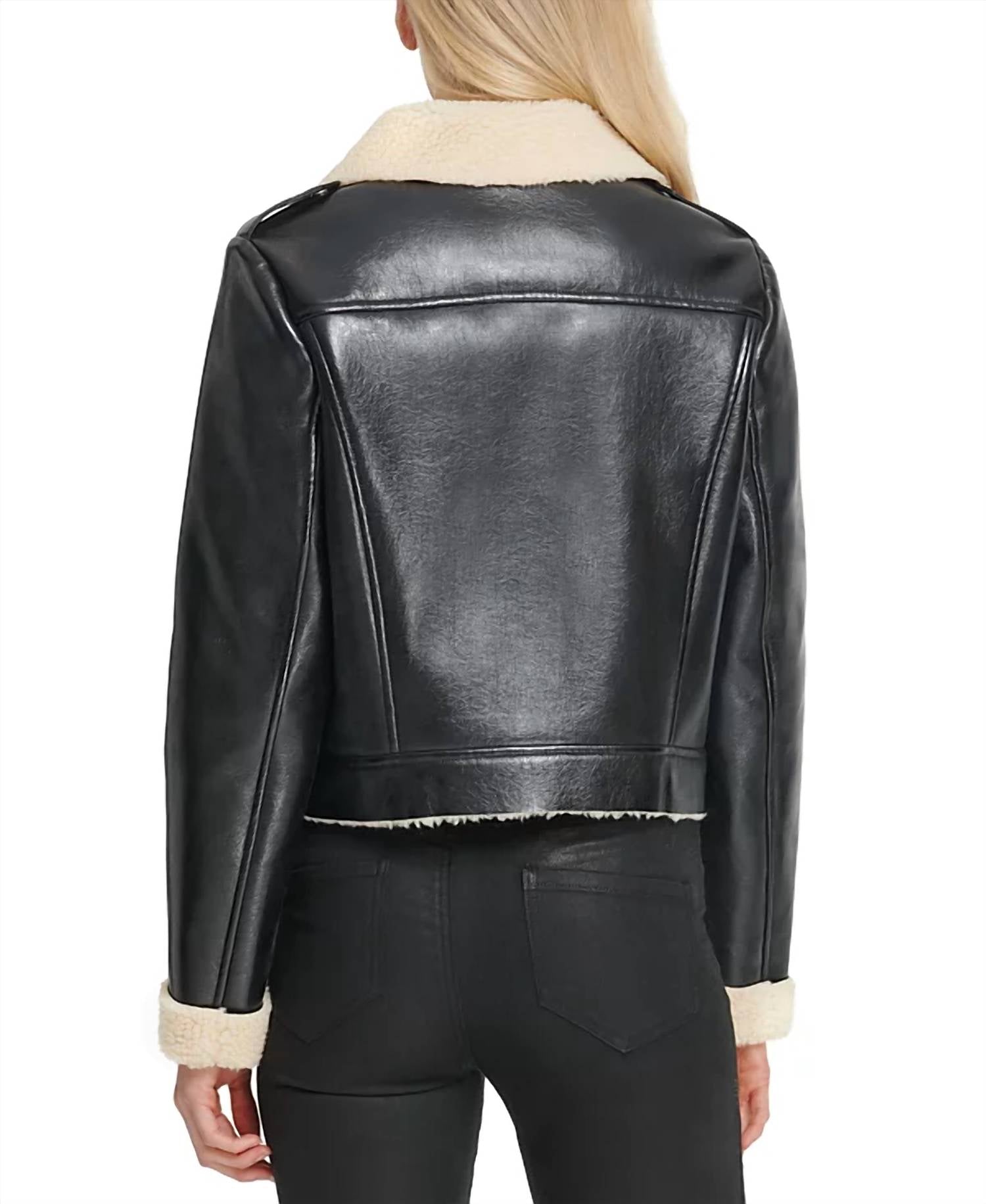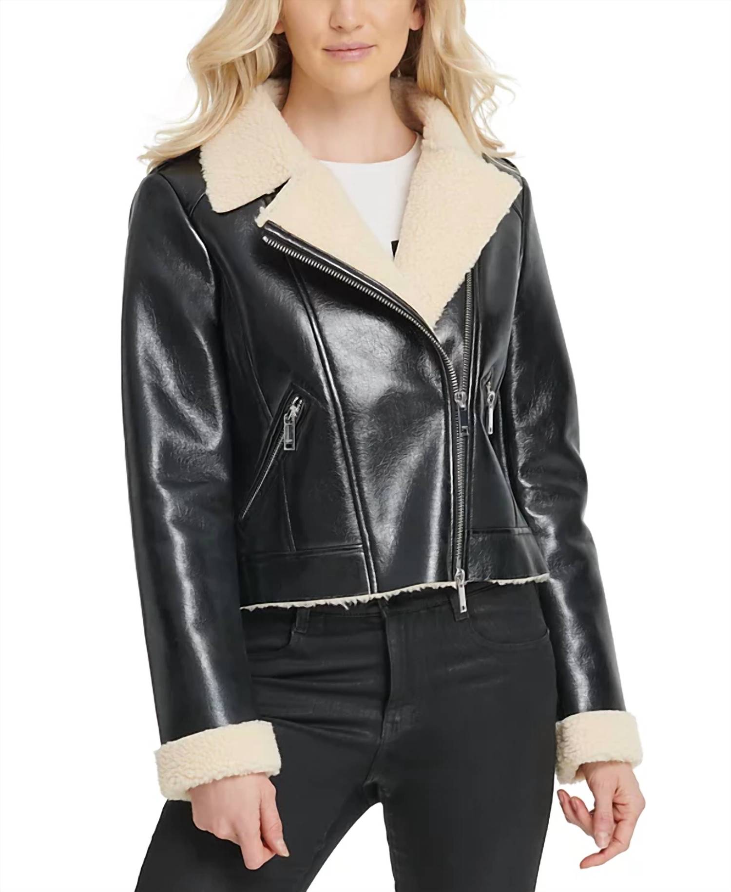 Elevate your outerwear collection with the DKNY Faux Shearling Motorcycle Jacket in sleek black. Designed with long sleeves and a stylish notched collar, this jacket features an asymmetrical front zip closure and measures approximately 20" long from center back to hem. Crafted from faux leather polyurethane with a cozy faux-fur polyester lining, it ensures warmth and a luxurious feel. Complete with two front zipper pockets and designed for easy maintenance with dry clean care instructions.
