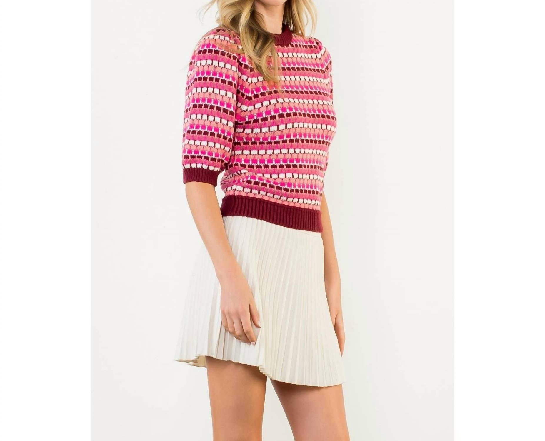 A classic fit that works just as good buttoned as it does left open. Introducing the Etta Knit Top by THML, a cozy addition to your wardrobe with its charming textured stripes and puffed elbow sleeves. Crafted from a viscose blend, it combines 43% viscose, 32% nylon, and 25% polyester. This pull-on piece features a crewneck design and is perfect for adding a touch of color in pink multi to your summer vacation outfits. For best care, hand wash and lay flat to dry.