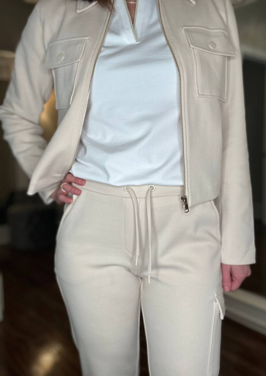 No gym necessary for these cool-girl joggers. Introducing the Yest Rillia Pant in versatile beige, an essential addition to any wardrobe. These women's track pants feature a high-rise fit and a convenient pull-on closure, enhanced by an elastic waistband with a drawstring for personalized comfort. Crafted from a soft cotton blend with a piqué texture, these ankle-length pants also include functional pockets. Composition: 82% Cotton, 14% Polyester, 4% Elastane. Model is wearing size 4.