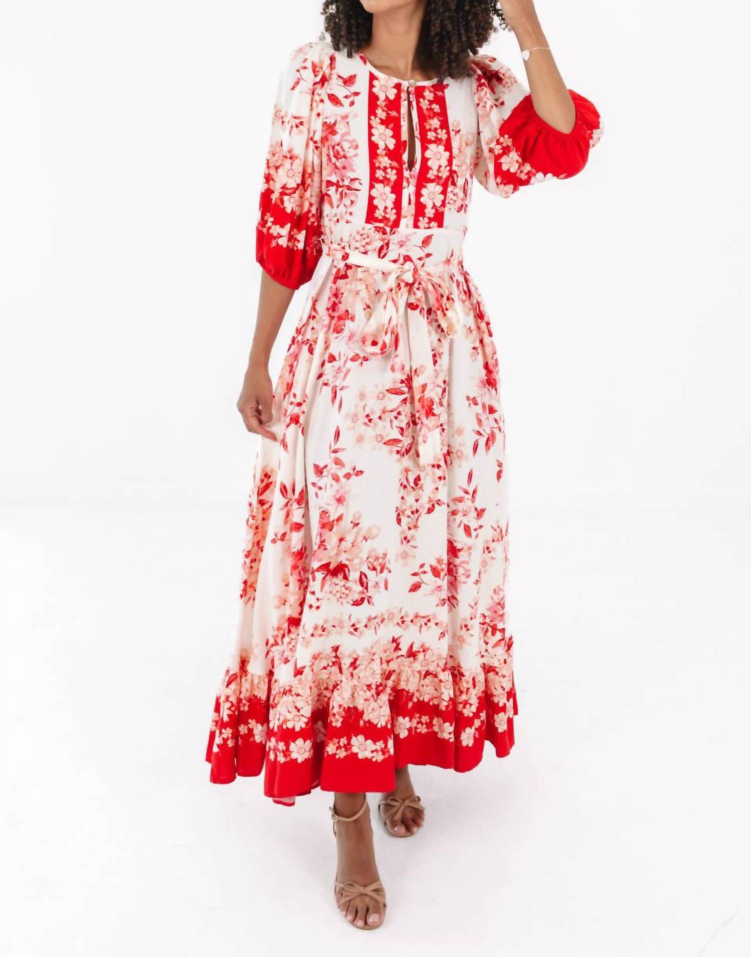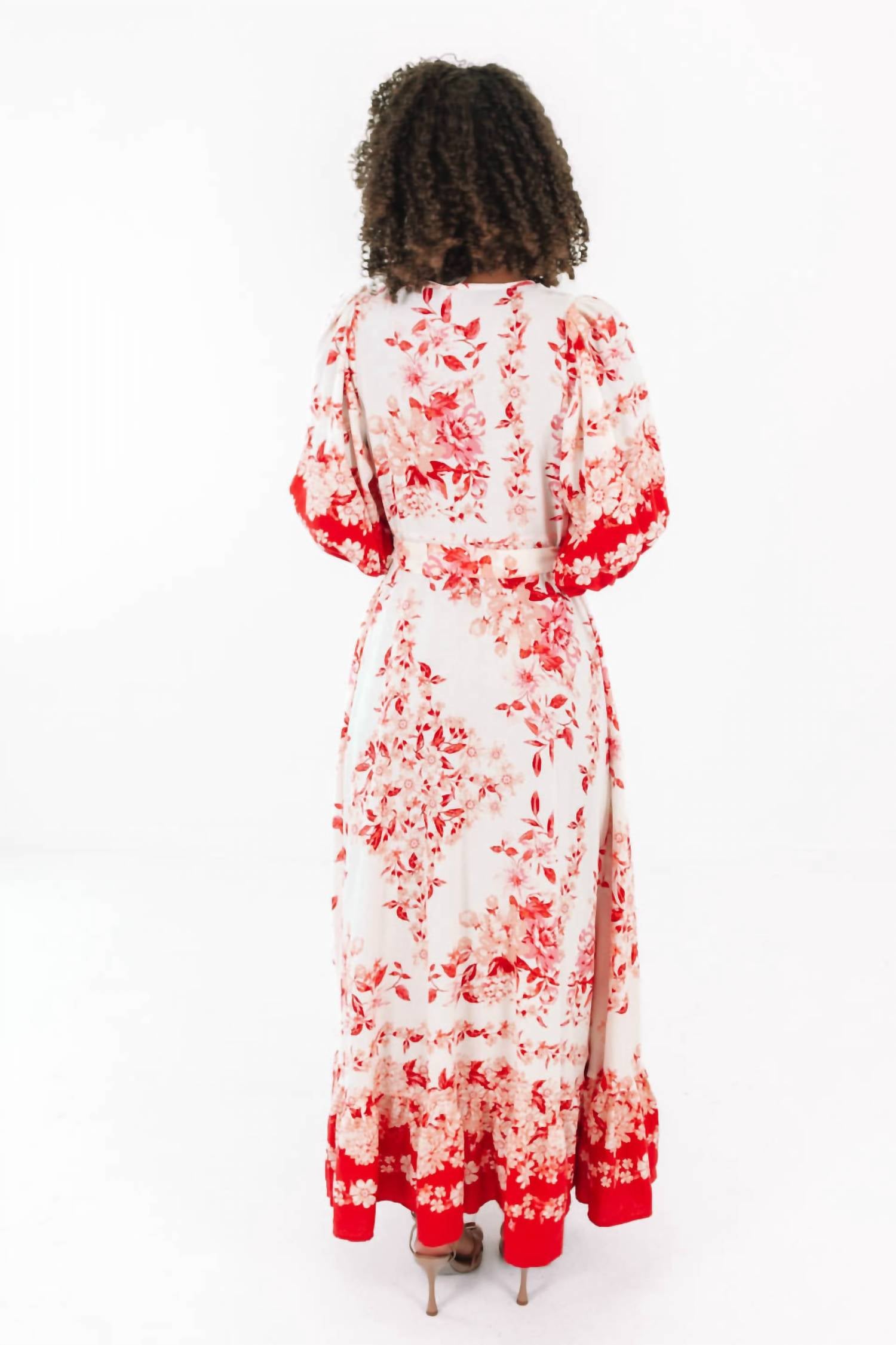 Style this maxi with your favorite statement necklace and sandals for the perfect look. Elevate your summer wardrobe with the Teresa Floral Maxi Dress by OLIVACEOUS, a boho chic addition in an Orange Multi floral pattern. Designed with three-quarter sleeves, this fit and flare silhouette features a flirty V-neck and charming button detail. Enjoy the practicality of side pockets and an adjustable front tie for a customized fit. Perfect for Easter and housewarming occasions, this dress invites you to twirl through any day with its flowy, single-tier hem design.