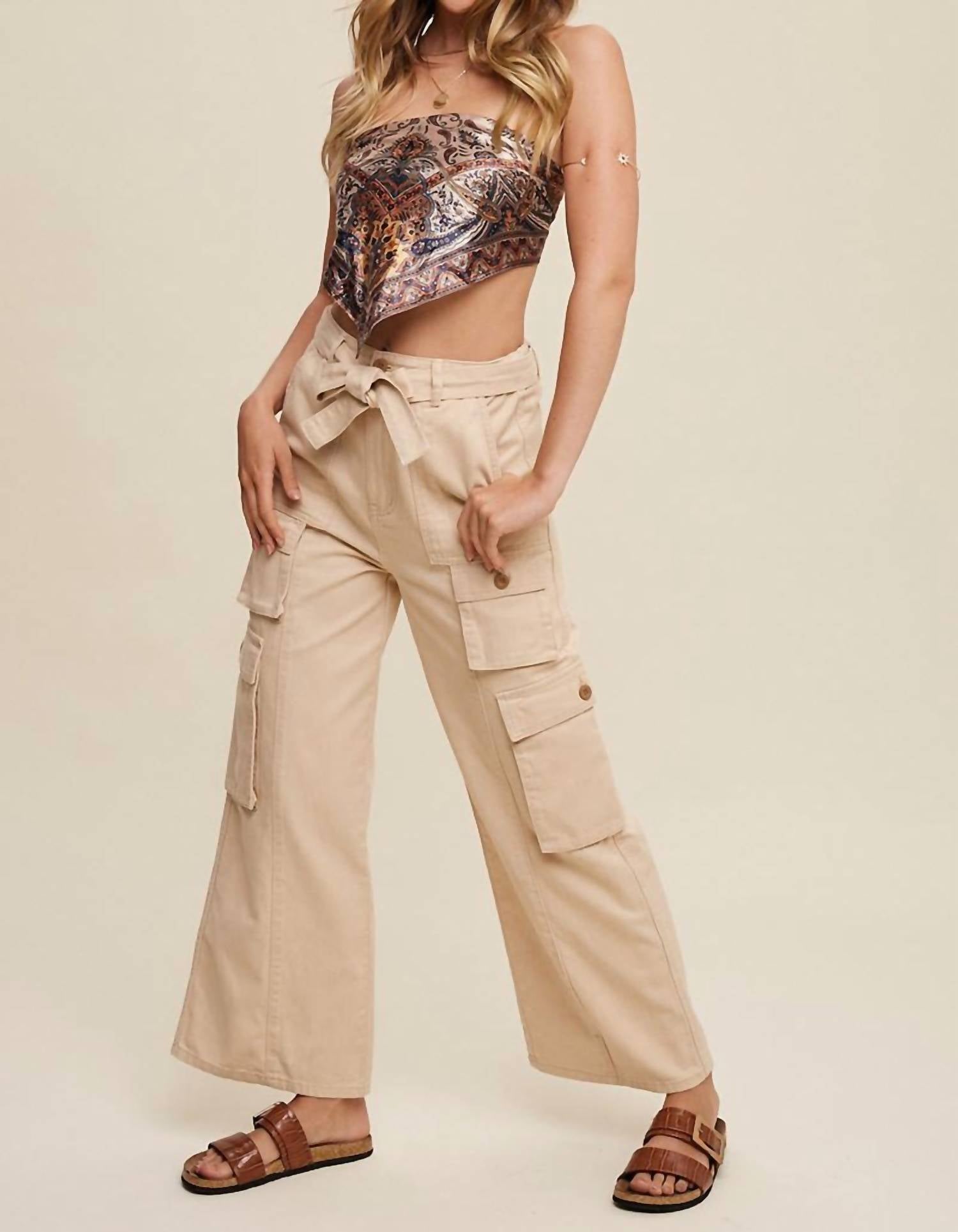 Introducing the Kirk Cargo Pants by Listicle, designed for a chic and minimalist appeal in champagne. These women's wide-leg pants feature a convenient zip closure and pockets for practicality. Made of 100% cotton, they offer comfort and breathability, ideal for a spring dinner party. Care instructions: Machine wash and tumble dry.