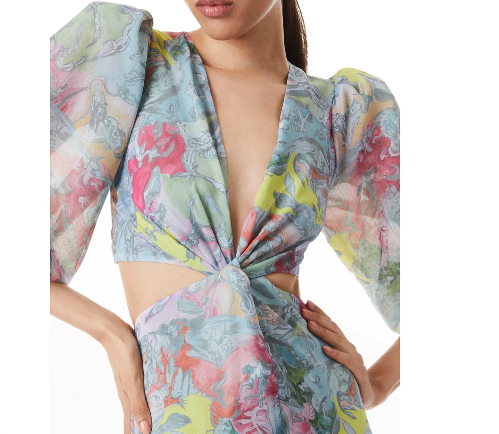 Zipper closure. Half puff sleeves; approx. 21.5"L. Approx. 55.5"L from shoulder to hem. High-low hem. 100% Polyester. Dry Clean Only. Imported.