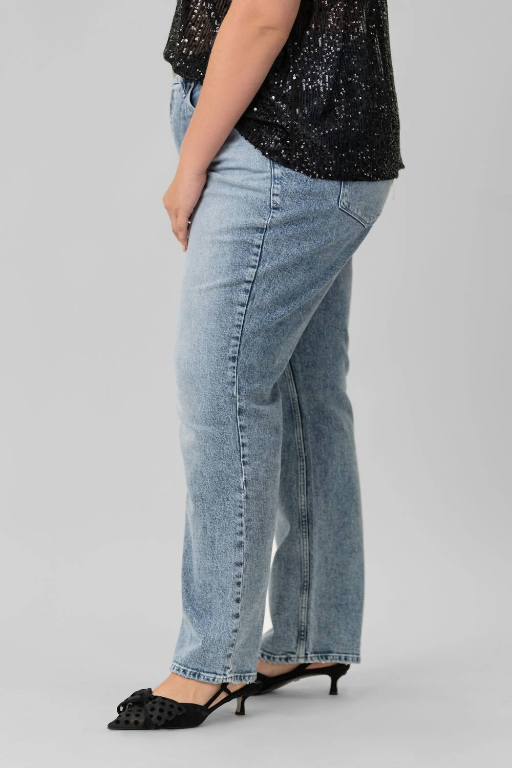 This classic straight leg jean has a perfect fit and goes with just about everything. Made with a cotton blend material, these high-rise jeans feature a relaxed fit and straight leg style, along with clean hems and a five-pocket design for practical elegance. Closure: Button closure. Crafted in China, these eco-friendly jeans embrace sustainable production with recycled materials and an eco-kind wash process. Machine wash and lay flat to dry for long-lasting appeal.