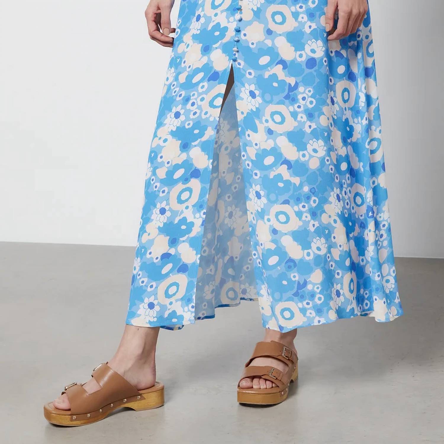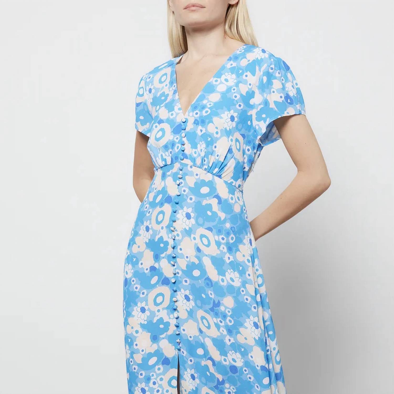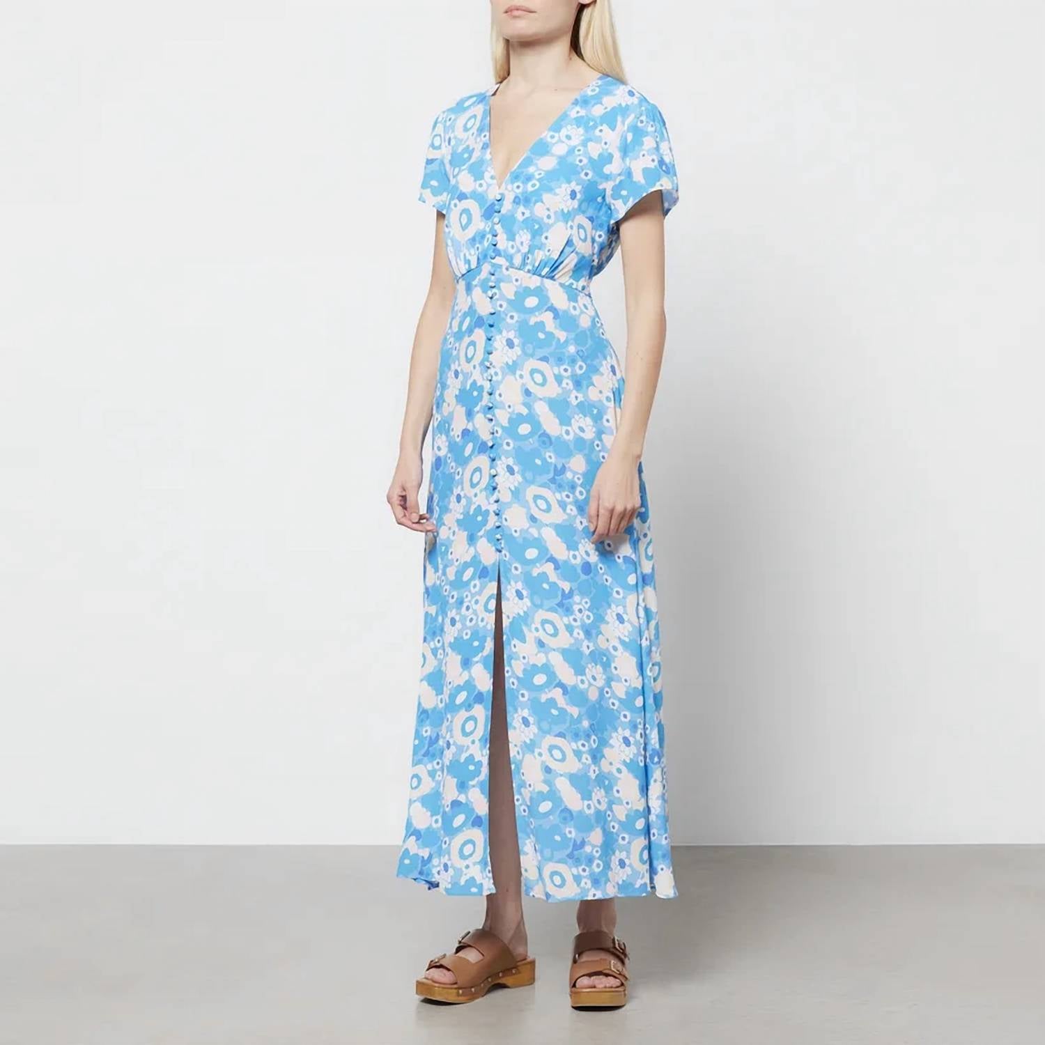 The RIXO Aspen Midi Dress from the Ariel collection brings a touch of elegance with its short sleeves and vibrant Blue Scandi floral print. Crafted from 100% polyester crepe, this sheath dress features a V-neckline and covered button closure for elevated sophistication. The design offers a midi length with a front slit, perfect for pairing with both sneakers and heels. Care: Hand wash.